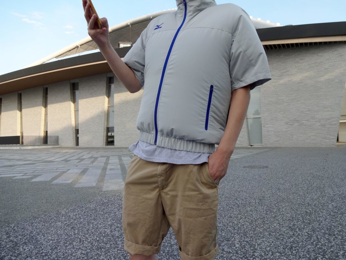 今回お試ししたのがコレ! ミズノの「エアリージャケット半袖」です! こちらはファンから取り込んだ空気が首の前後、腕から抜けるパターン設計で、体温が上がると汗をかき、蒸発する際の気化熱で体温を下げるメカニズムを利用したファン付ウエアです。あまり作業着っぽくないシンプルなデザインもポイントですね! ちなみに2018年にワークウエアとして長袖を発売し、それをライフスタイル向けに開発したのが今回のエアリージャケット半袖となります。