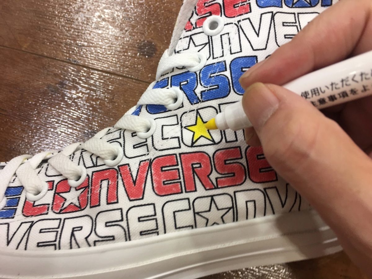 ホワイト地のアッパー全面にはコンバースロゴがプリントされていて、そこを好きなように塗れちゃうってわけですね~。“ペンは油性 or 水性!? どっちがイイの? ”って心配はご無用! オリジナルデザインの布生地用のファブリックペン(レッド、ブルー、イエロー)が付属するので、自由に塗って楽しめちゃえるのです!