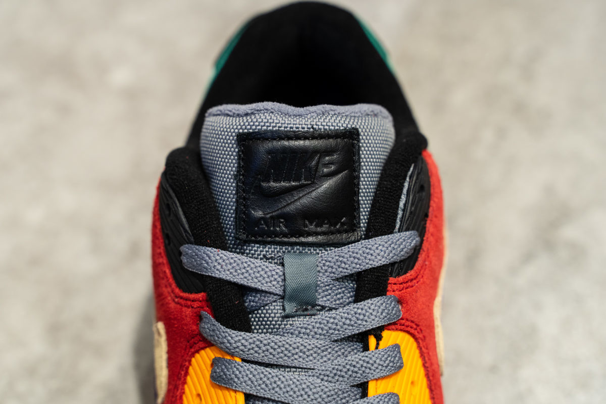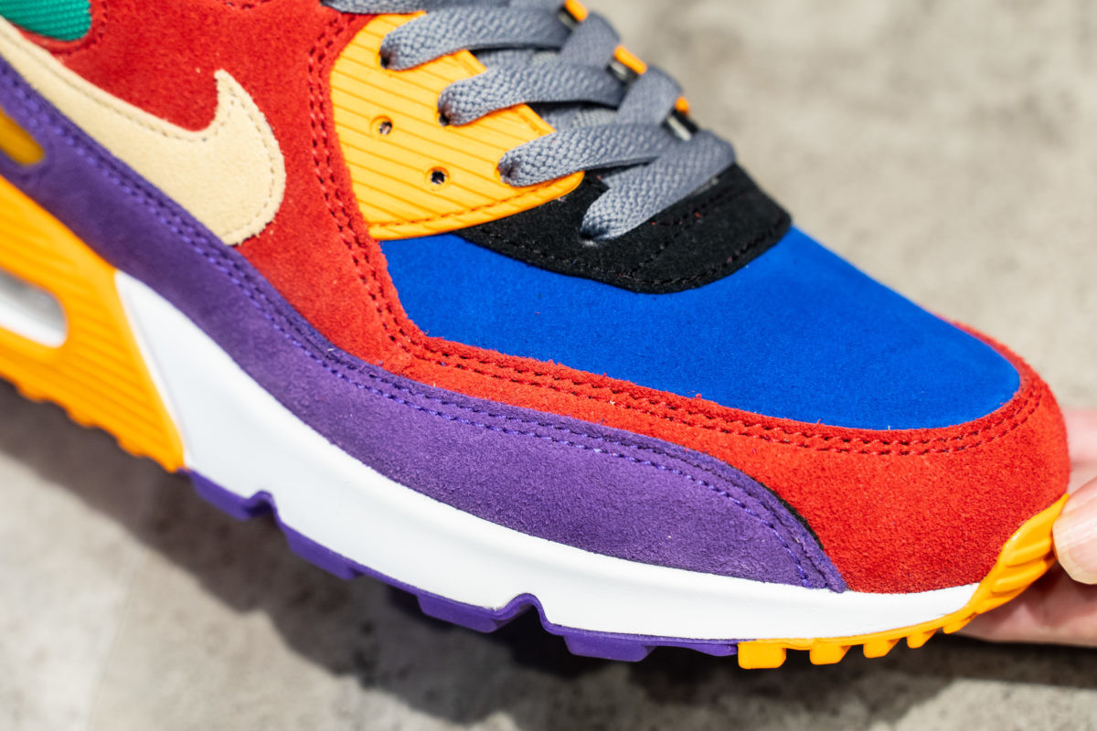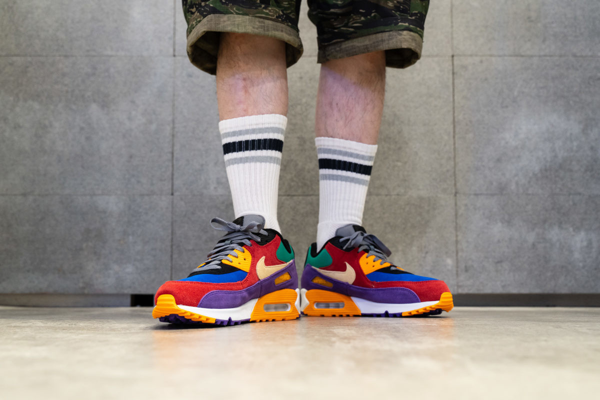 アッパー全面には上質なスエードを配して、通気性を保つバリスティックメッシュのシュータンがアクセントとして効きまくる今回のエア マックス 90。2000年代前半に日本限定でリリースされたナイキ ダンク LOW レインボーへのオマージュ的作品となります。