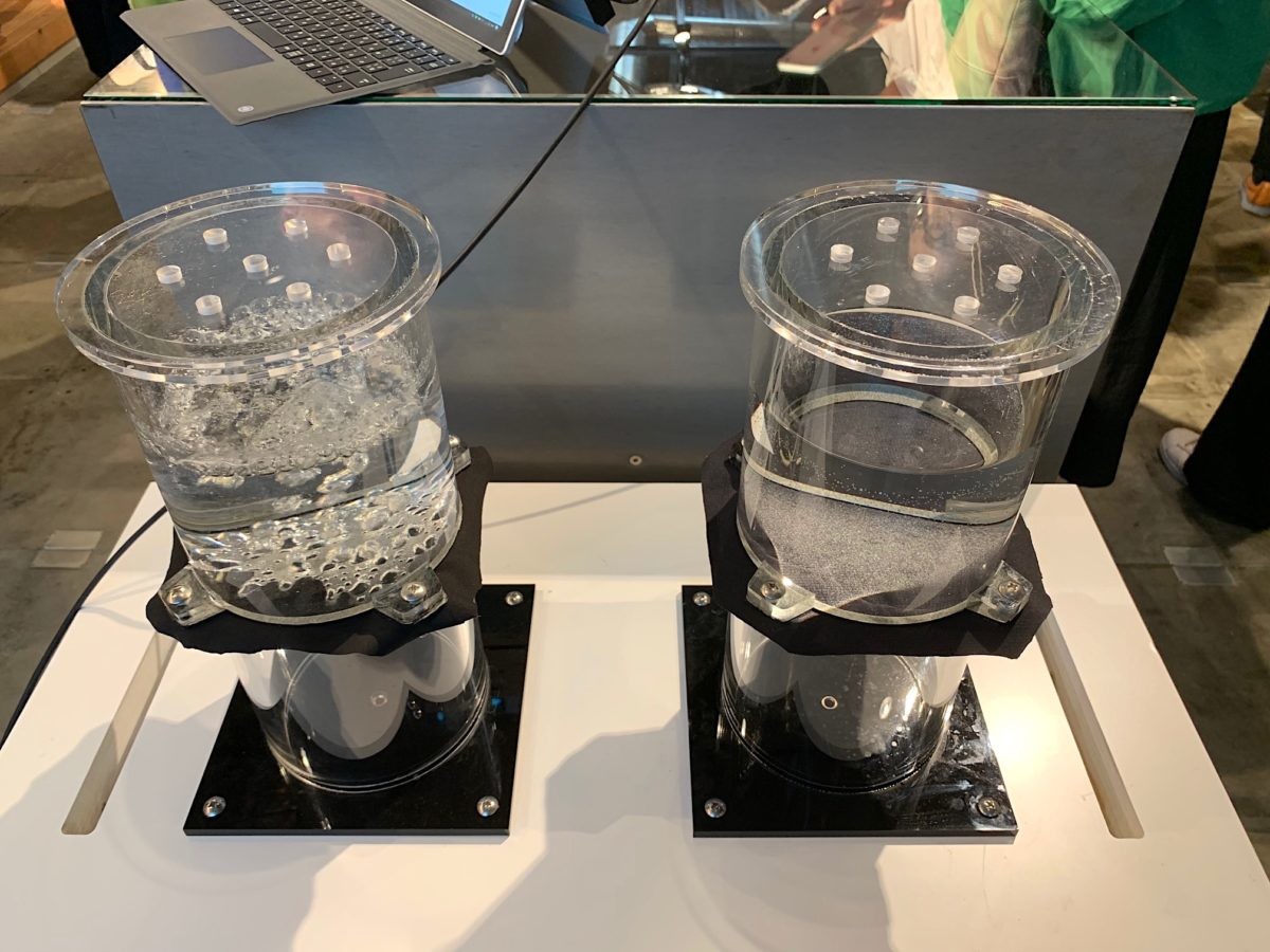 以前の展示会では、2つの筒にFUTURELIGHTと従来の防水素材をそれぞれ挟み、生地の上に水を貯め下から空気を当てる装置を設置していました。これは実に、素材の意義がわかりやすかったです。