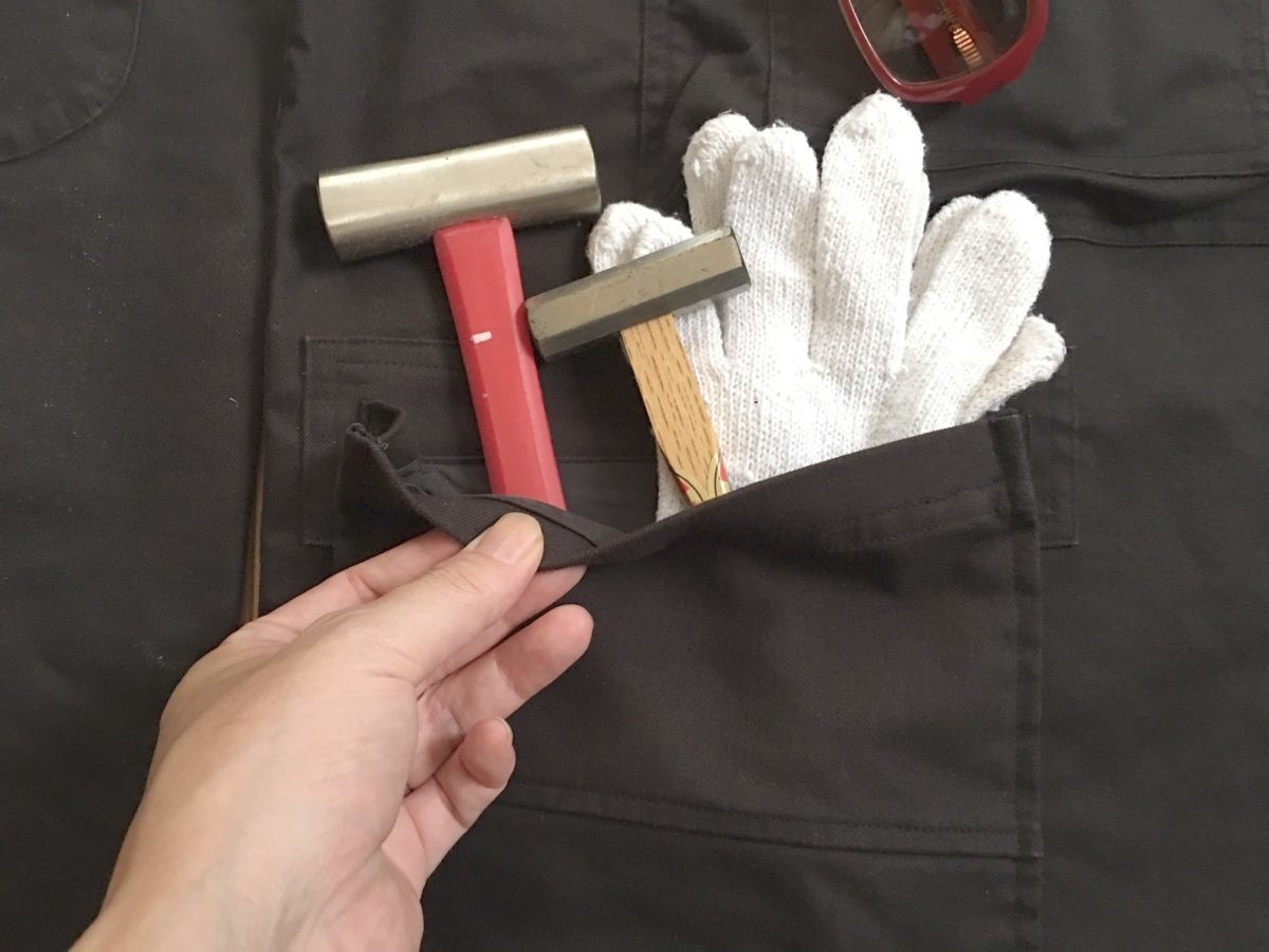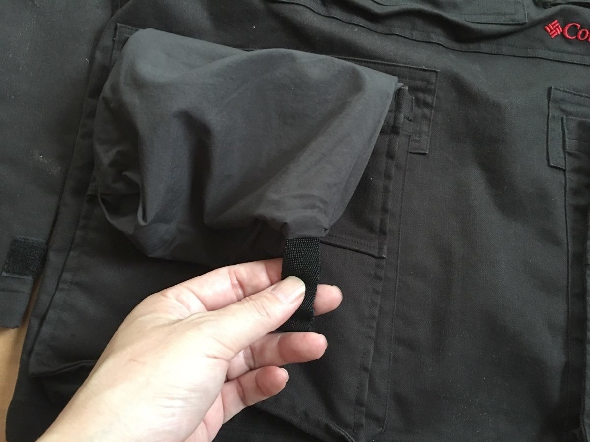 左右の腰にもマチ付きの大型ポケットを配置。ここには焚火の火種を作る際に必要な小枝や落ち葉などを集めて入れておくことができ、内側のループを引っ張ることで裏地ごとひっくり返し、枝や落ち葉カスを取り除く工夫がされています。