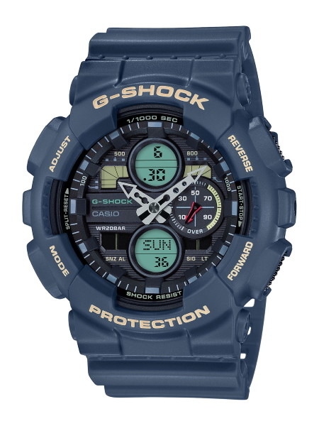 メタルベゼルはカジュアルなブルーを採用。落下時に衝撃が伝わりにくいボタン構造も魅力です。●ケース縦52×横46.4mm