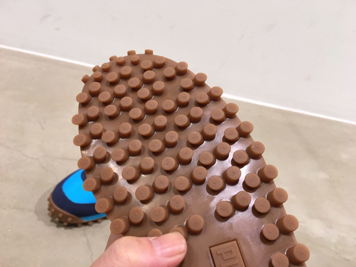 こちらが本作の最大の特徴と言えるフェダーバインソールです。二股に形成されたスタッドが着地の瞬間、左右に押し広げられ、衝撃を分散してくれるのです。さらにミッドソールもフェダーバインソールに最適なEVAへとアップデートされています。
