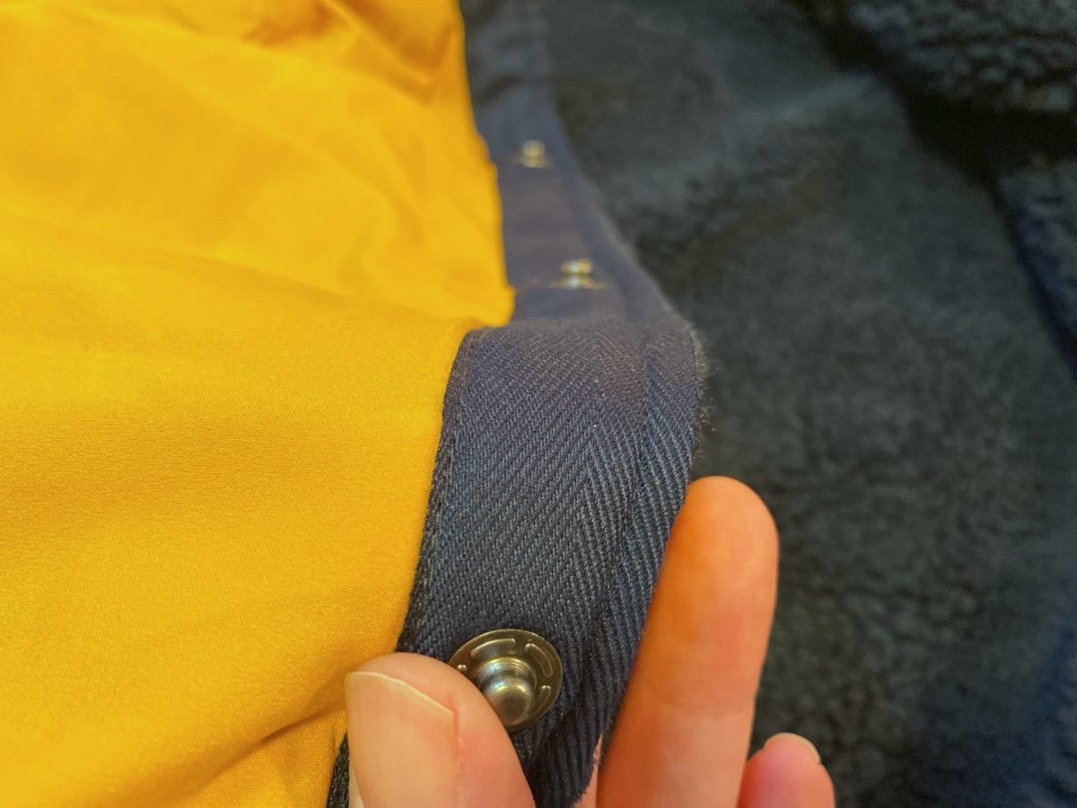 フロントのスナップまわりはヘリンボーンの生地に切替えられていて耐久性を高めています。