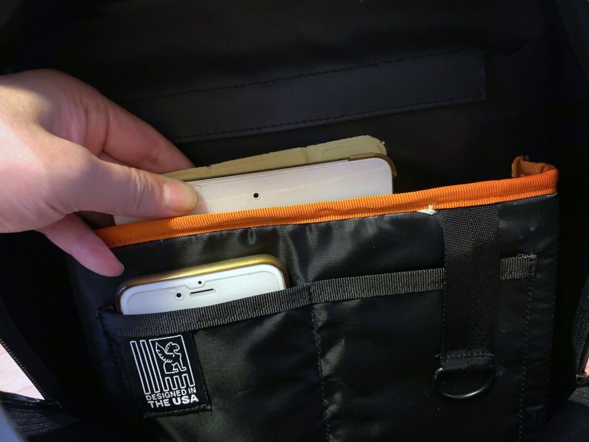 フロント上部のポケットはiPadミニサイズのタブレットなら余裕で出し入れできちゃいます。