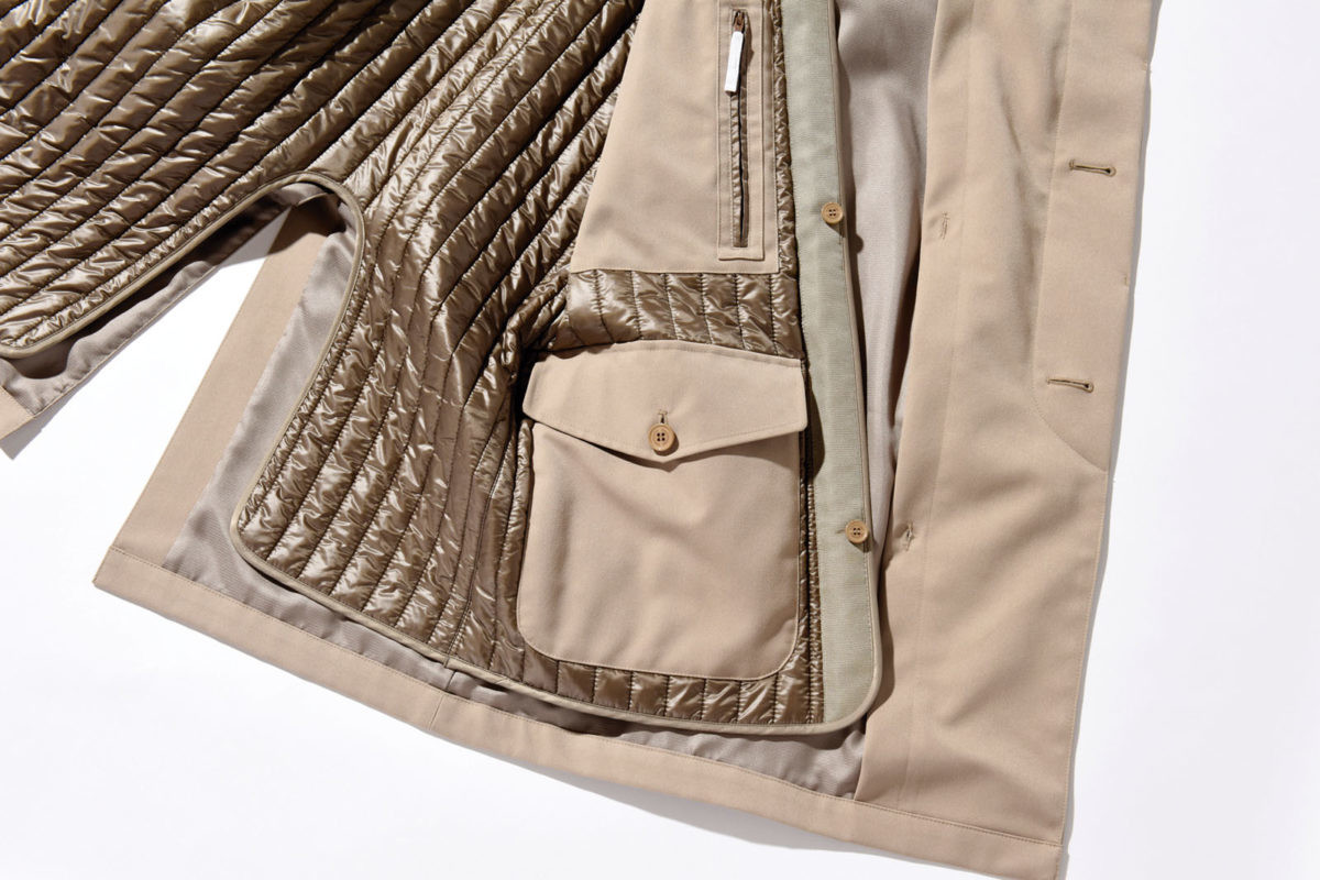 ふっくらとした質感の尾州産生地を使用。背中〜胸には、一般的なインナーダウンよりも厚みを7割抑えつつ、保温率は同等という極薄の中綿を搭載しています。肩パッドをなくし、芯地も少なくして軽快な着心地に。