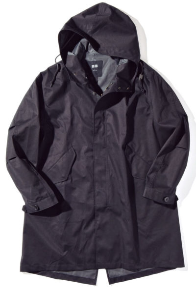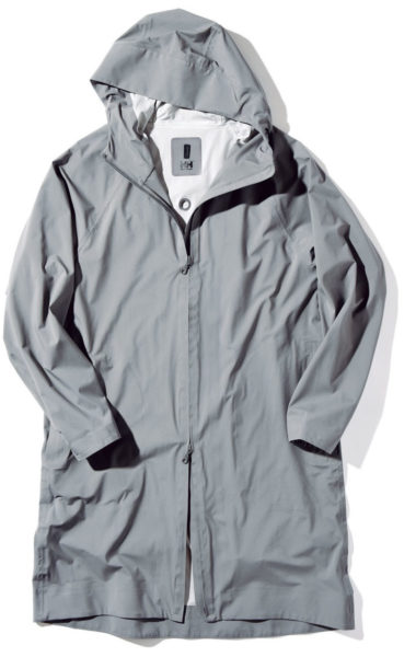 「保温性はさほど重視しない」という人には、スーツの上からラフに羽織ってカッパのように雨風をしのげる、こんな高機能フーディがオススメ。長い着丈と、フードのボリューム感がスタイリッシュです。
