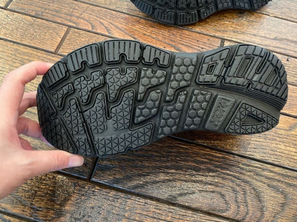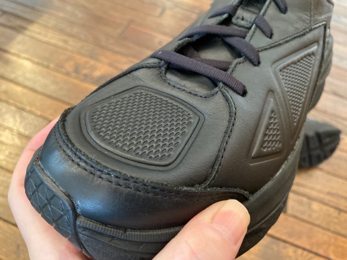 ヒールの上部にはリフレクター付きのストラップが設けられていて、オールブラックながらも夜間の視認性を高めています。