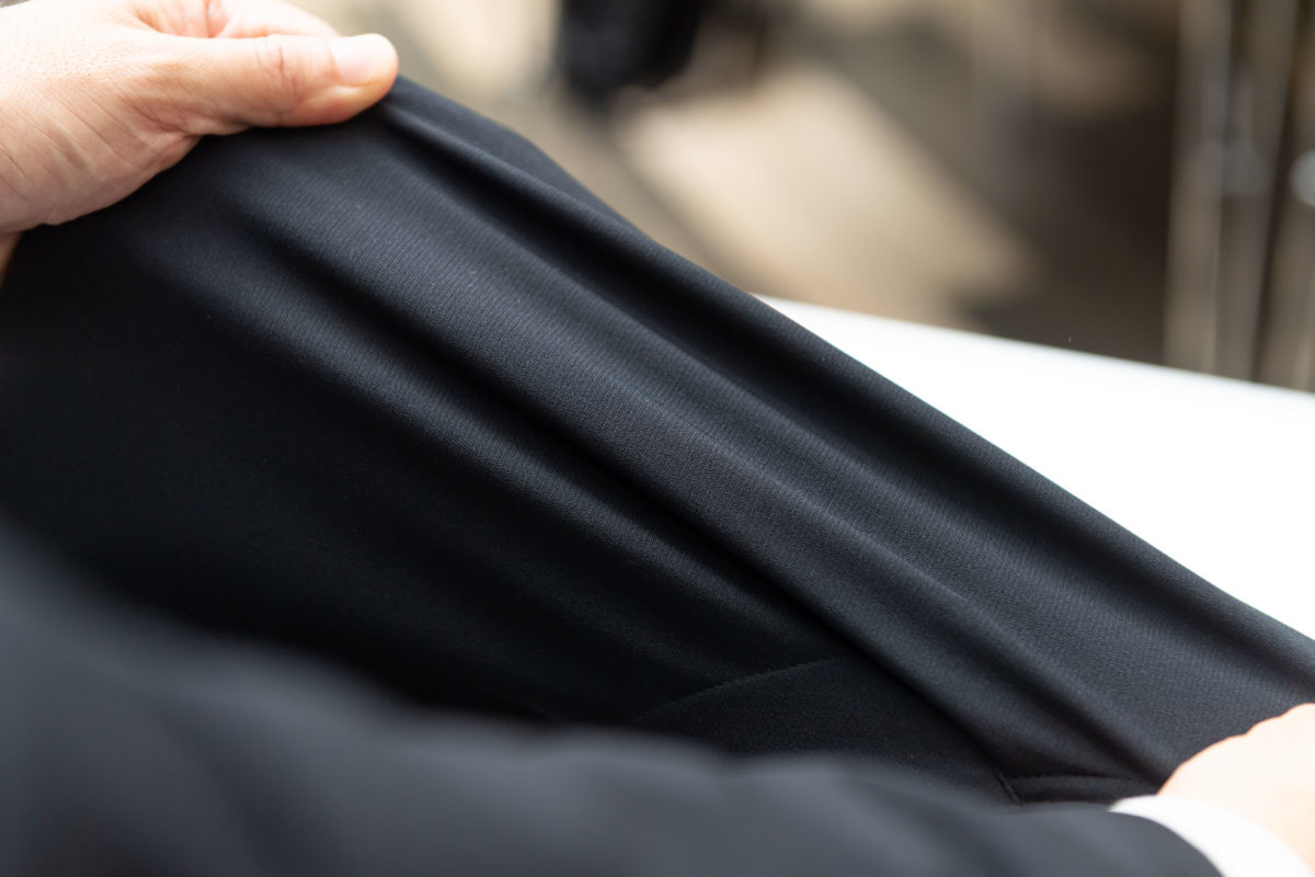 その他の魅力を尋ねると、金さんが手に取ったのはスラックスパンツでした。コンセプトソースの足元に一番近いアイテムからデザインを進めたため、魅力も一番詰まっているのだと教えてくれました。聞けば、“ビジネスシーンだけでなく、休日にも着ていただきたい”。そんな、ONとOFFで着まわしができる仕掛けがあるそうです。「ストレス軽減のためにベルトなしでも着用できるよう、ウエストの内側には紐がついています。後ろ側全体にゴムをあしらったので、ウエストの可動域が20 センチほどあります。そのため、体形が変わってもカバーできる設計になっています。また、ベルトループがついているので、ベルト着用の際は後ろのゴムが隠れ、よりフォーマルな印象を与えられるようにデザインしています」。