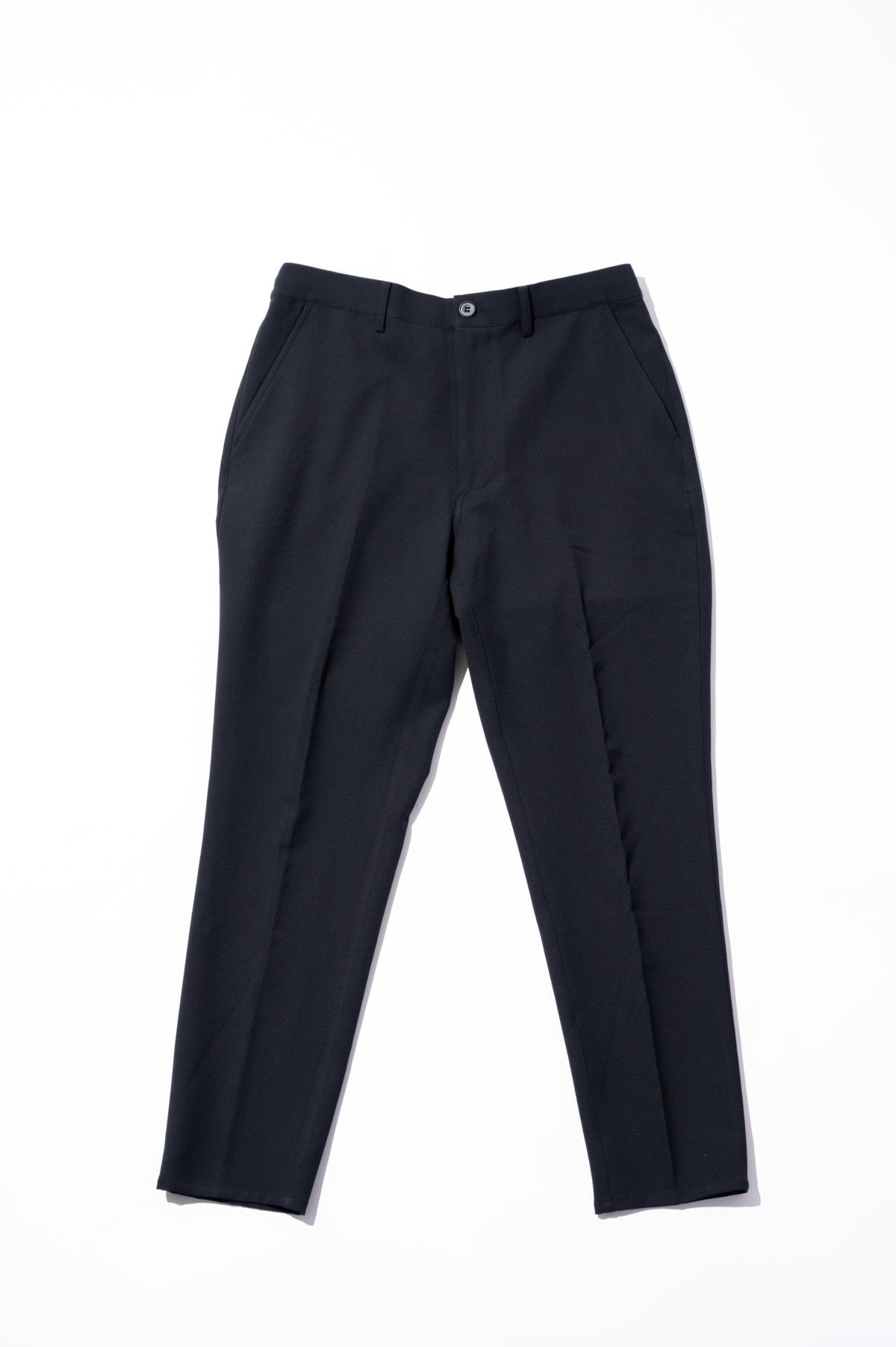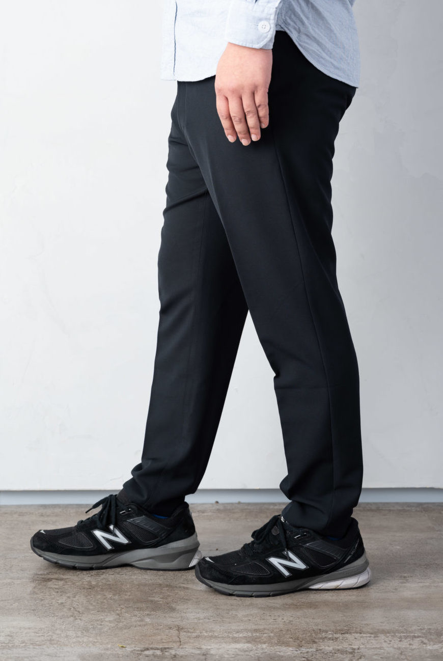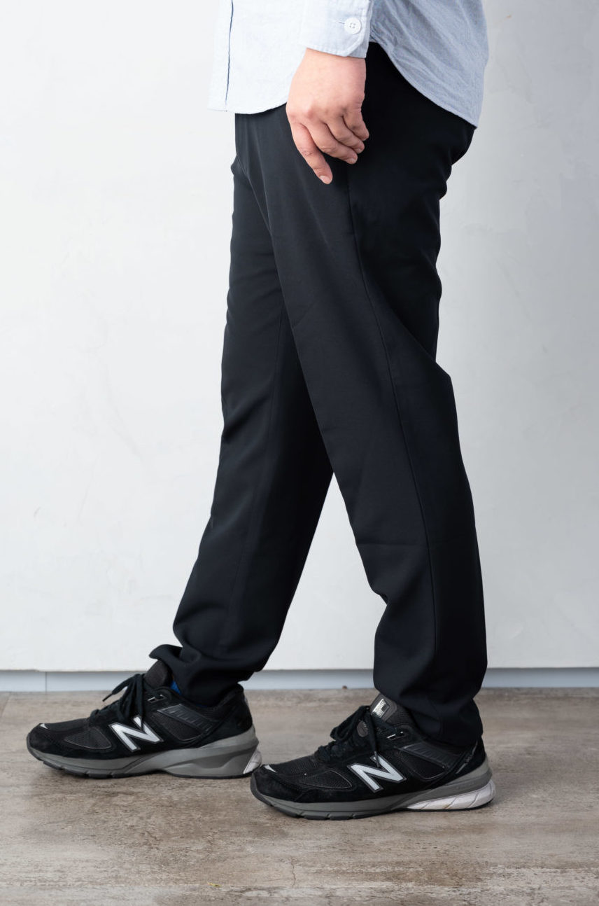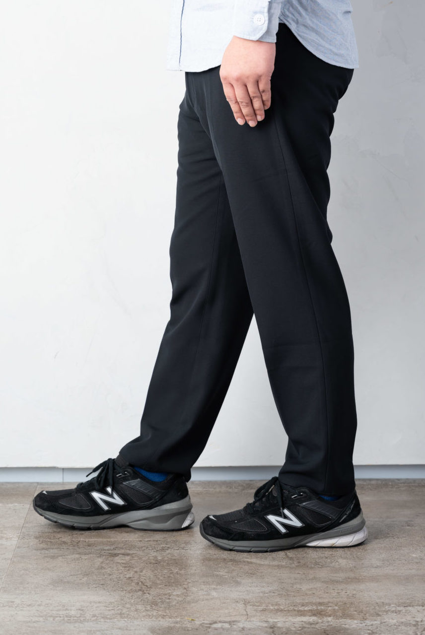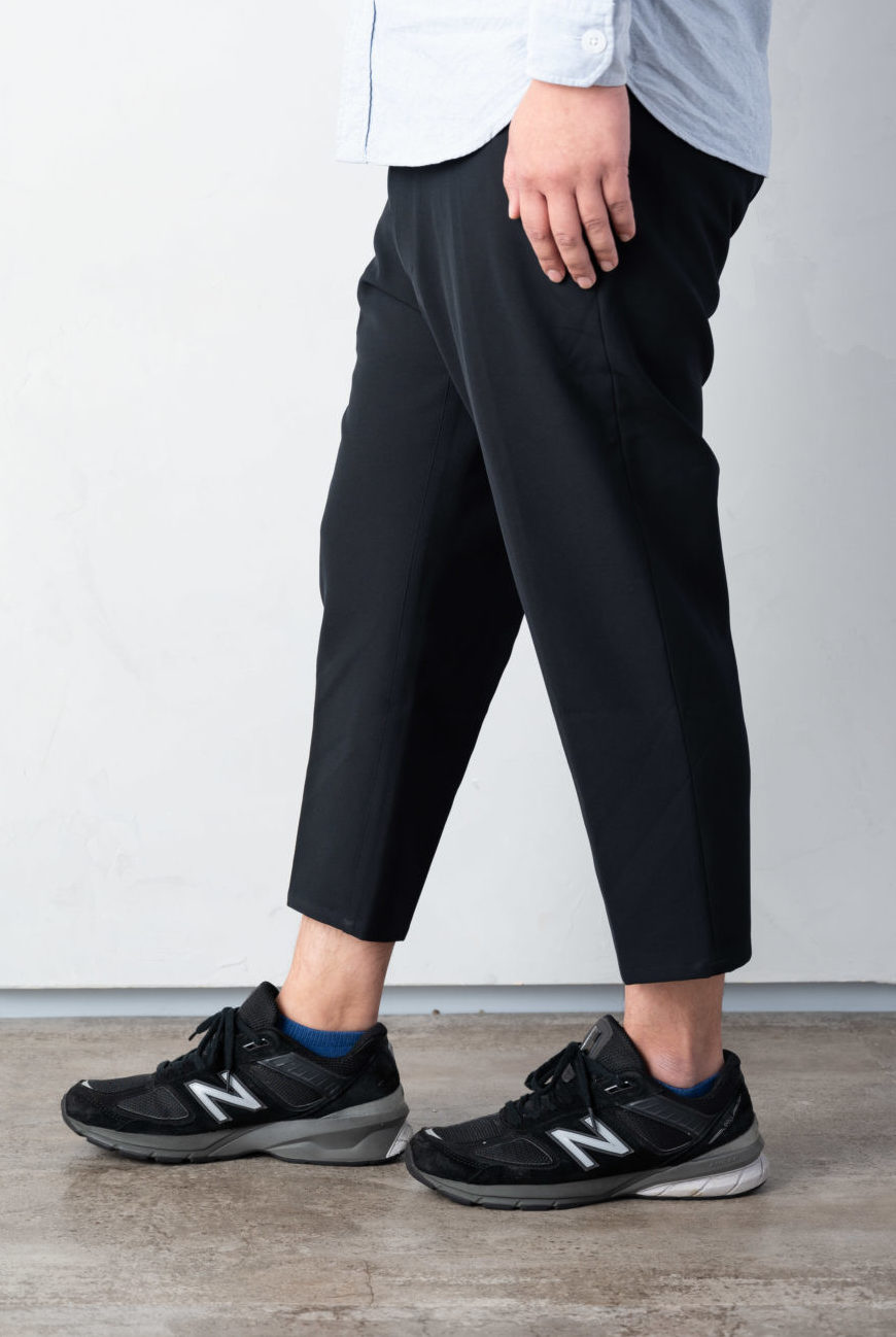 さらに「カラー展開は、ネイビーとブラック、ダークグレー。そこに、クラシックなストレートに加え、スキニー、スリムテーパード、ワイドテーパード、クロップドテーパードと、5種類のシルエットを用意しました。1本のシルエットで着まわしをしていただいてもいいですし、何本か購入し、TPOやその日の気分で選んでいただいても楽しいと思います」。お客さんに選ぶ楽しみを提供する仕掛けということです。着用イメージは以下の比較写真をご覧下さい。なお、編集部でも着用してファーストインプレッションをしてみました。