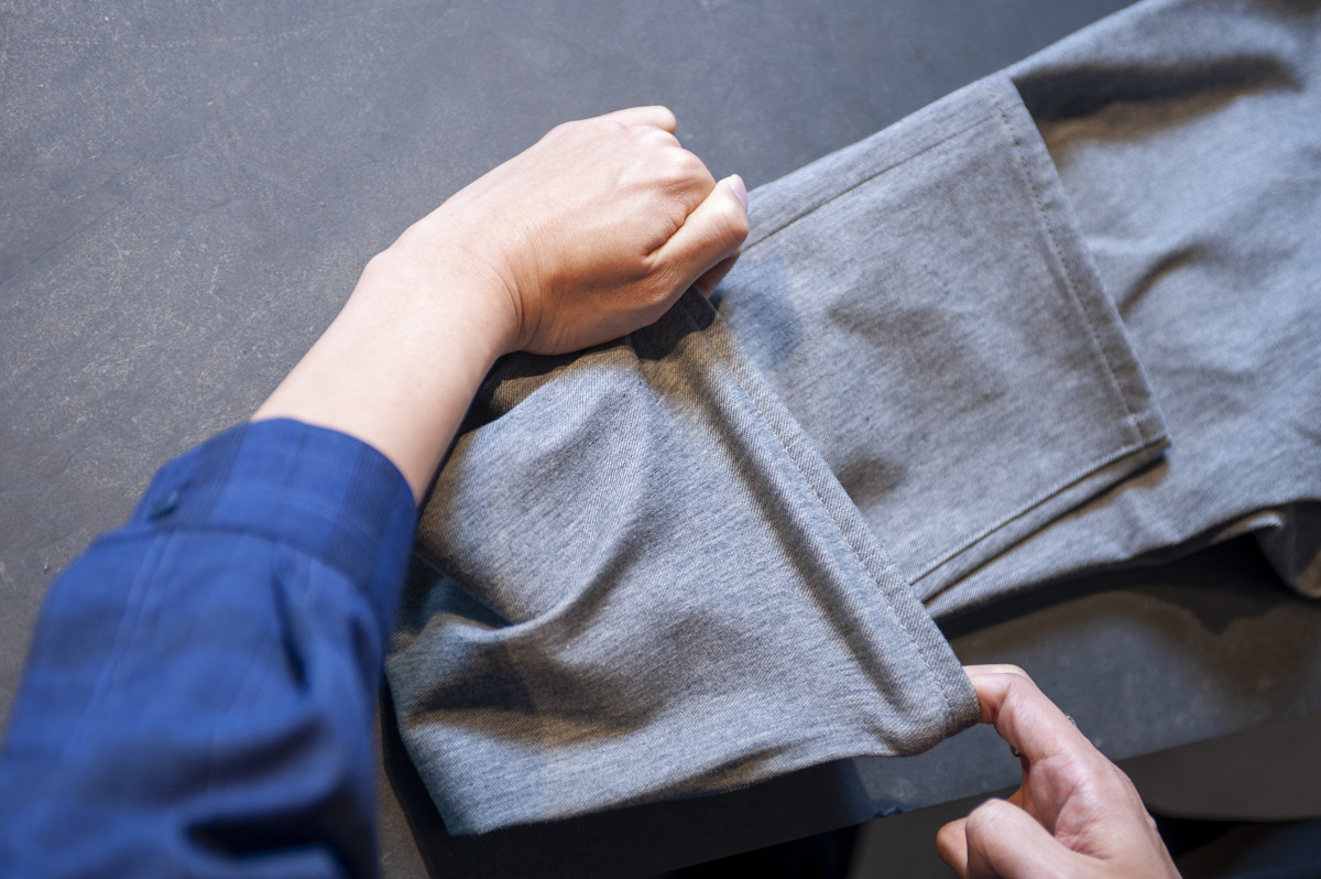 「一般的なスキニーパンツの生地は布帛(ふはく)で、ストレッチが効いていても横にしか伸びないものが多いんです。それは穿いているうちに膝が伸びてくるし、締め付けられて窮屈感が強いはず。布帛は、脚の太さには対応するように横に伸びますが、縦には伸びないのです。そのウィークポイントを解消するために弊社は、約4年の歳月をかけて、限りなく布帛に見えるオリジナルのニット素材を開発しました」。