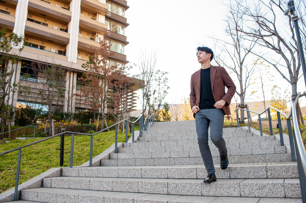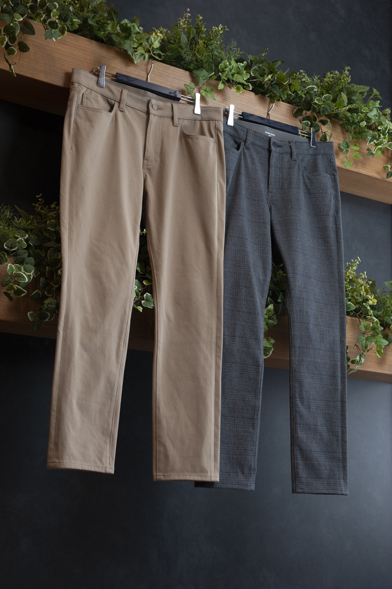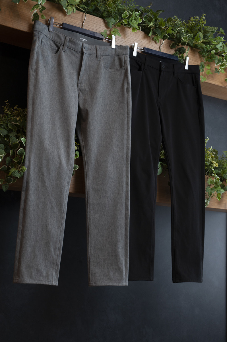 「僕はよく脚を組みますが、生地がとても伸縮するので、スキニーなのにストレスを感じません。ジャージのようにラクに穿くことができます! しばらく穿いてみましたが、シワがついていないのもいいですね。例えば子どもがいて屈伸運動などが多い親御さんにもよさそう」。