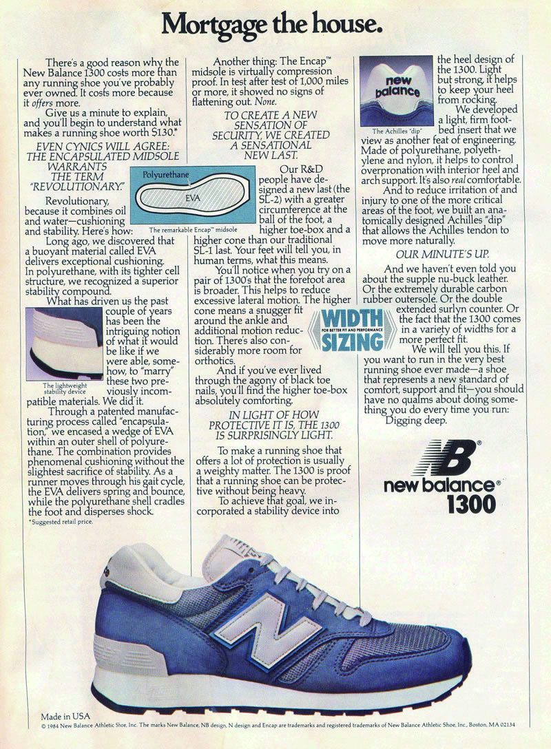 山崎 ランニングシューズのフラッグシップモデルとして、1985年に登場しました。クッション性に長けたENCAP(エンキャップ)を搭載する第一弾モデルがこの1300になります。ちなみに当時(1985年)のアメリカでの販売価格は130ドル(当時の日本の価格で3万9000円)でした。