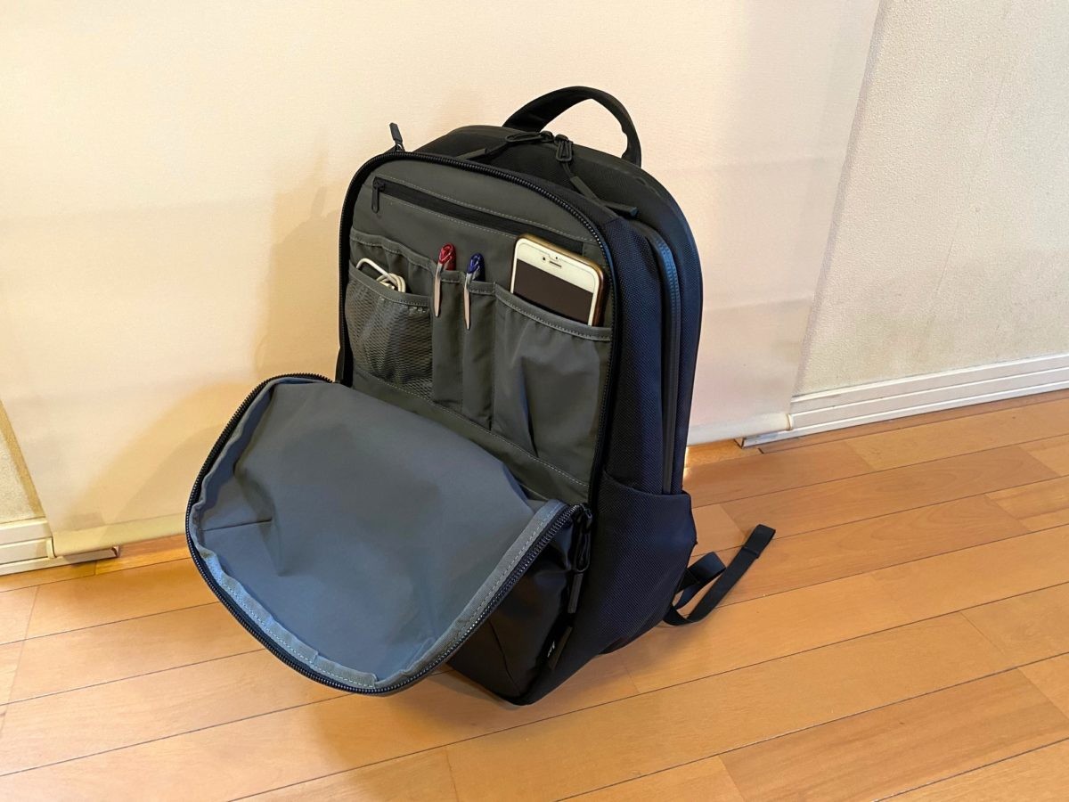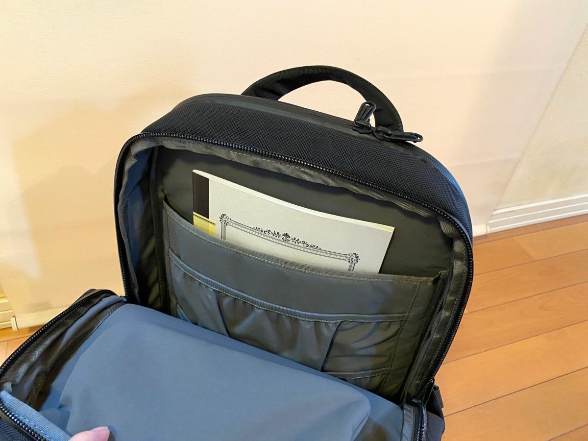コンパートメントが2つあるので、片方はテック系ギア用、もう片方はアナロググッズや着替え用などで使い分けるのもアリですね。