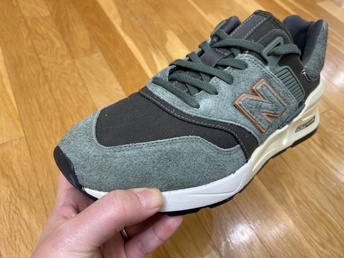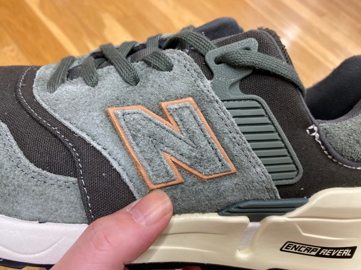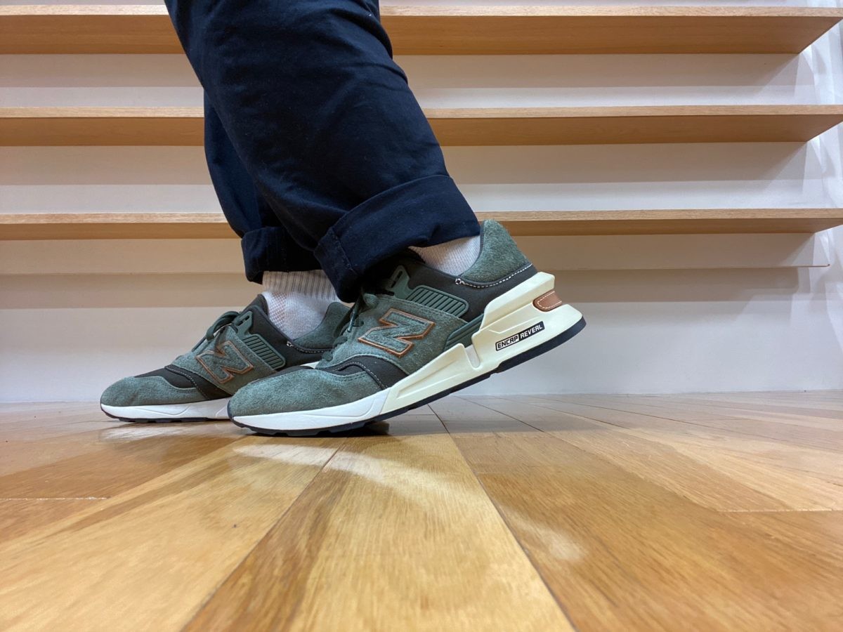 モダンなデザインが特徴的な997Sですが、コットン×スエードという素材コンビで渋い存在感を絶妙に醸し出していますね。そしてブラウンレザーのアクセントがシックな雰囲気も加えています。スポーツミックス系スタイルはもちろん、デニムなどのアメリカンカジュアルにもマッチしますよ!
