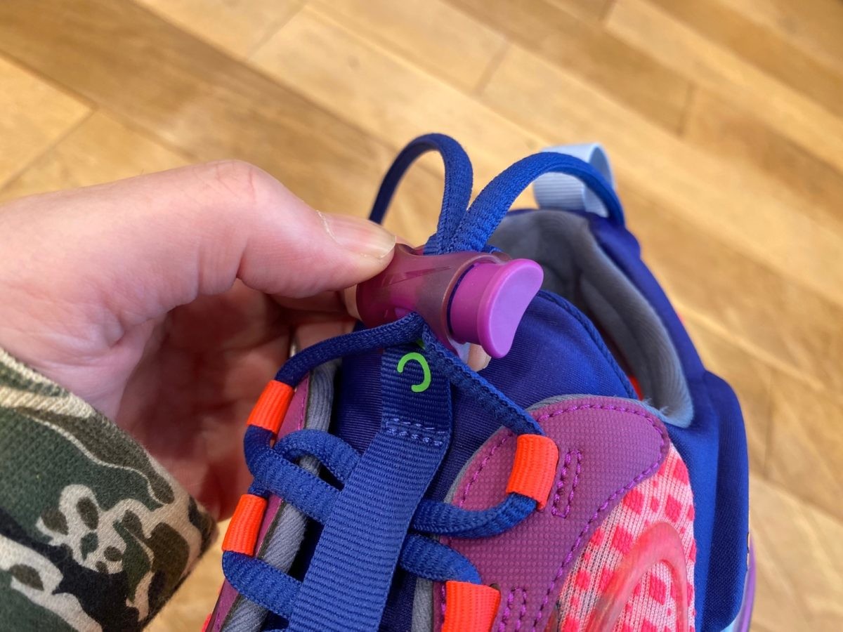 シュータンにはプラスチック製のストッパーが設けられていて、シューレースの調節がラクチンに。