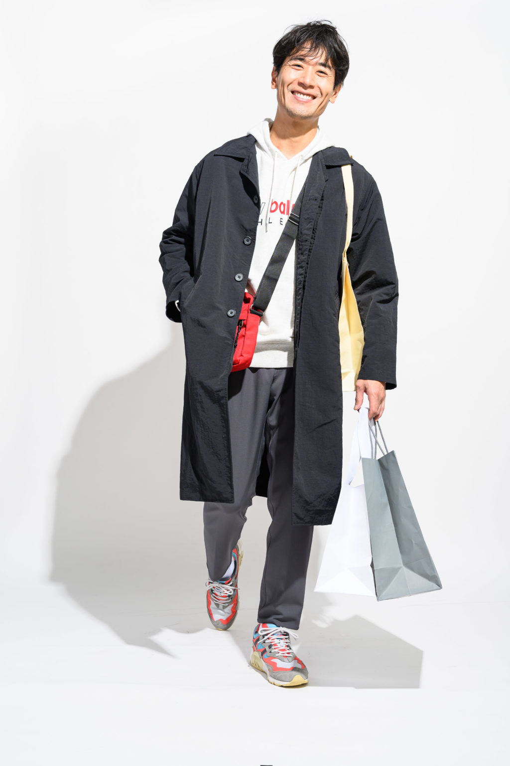 「ステンカラーコートと相性の良いフーディーを合わせてトップスにボリュームを出し、ボトムスはスキニーフィットパンツを合わせて上下のシルエットにメリハリを付けました。大人の休日スタイルをイメージしています。足元には少し派手なスニーカーで差し色を加え、コートの下にプラスしたサコッシュもアクセントのひとつです」(佐々木さん)