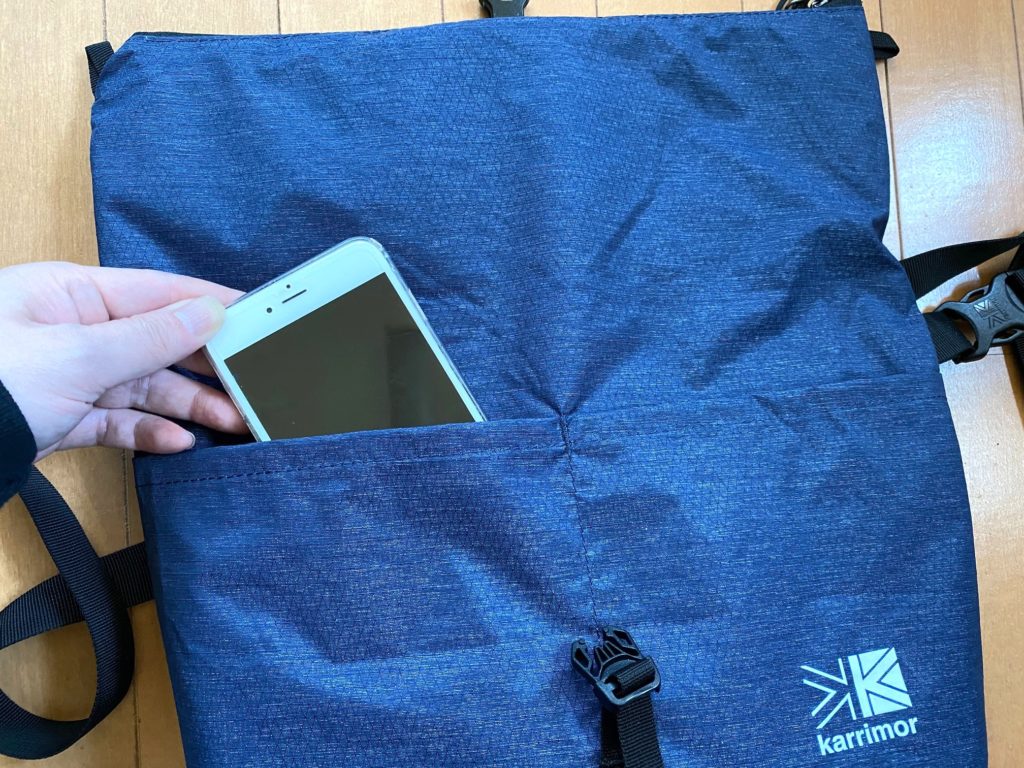 フロントには大きめなポケットが2つ設けられていて、スマホなどの収納に便利です。