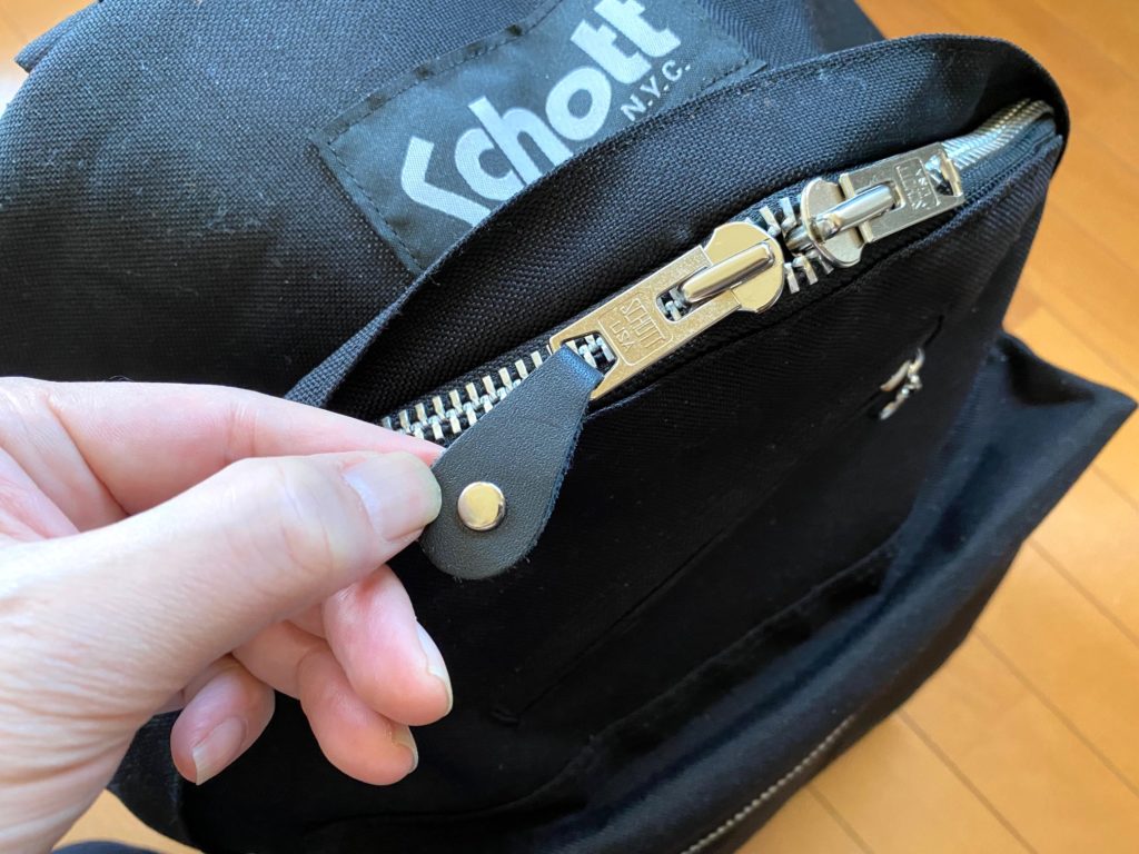 メインコンパートメントとフロントポケットにはショットオリジナルのジップを使用し、持ち手もライダースに使われるレザープルタブが採用されています。
