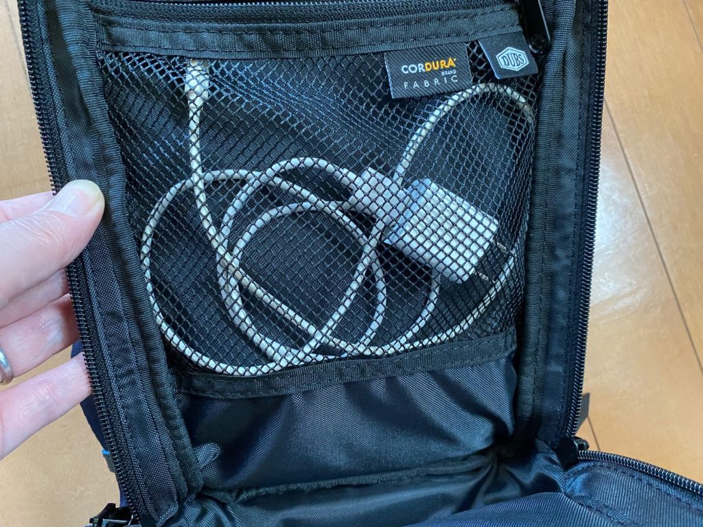 さらに内部にはメッシュポケットも設けていて、スマホの充電ケーブルやイヤホンなど小物の収納に便利ですね。