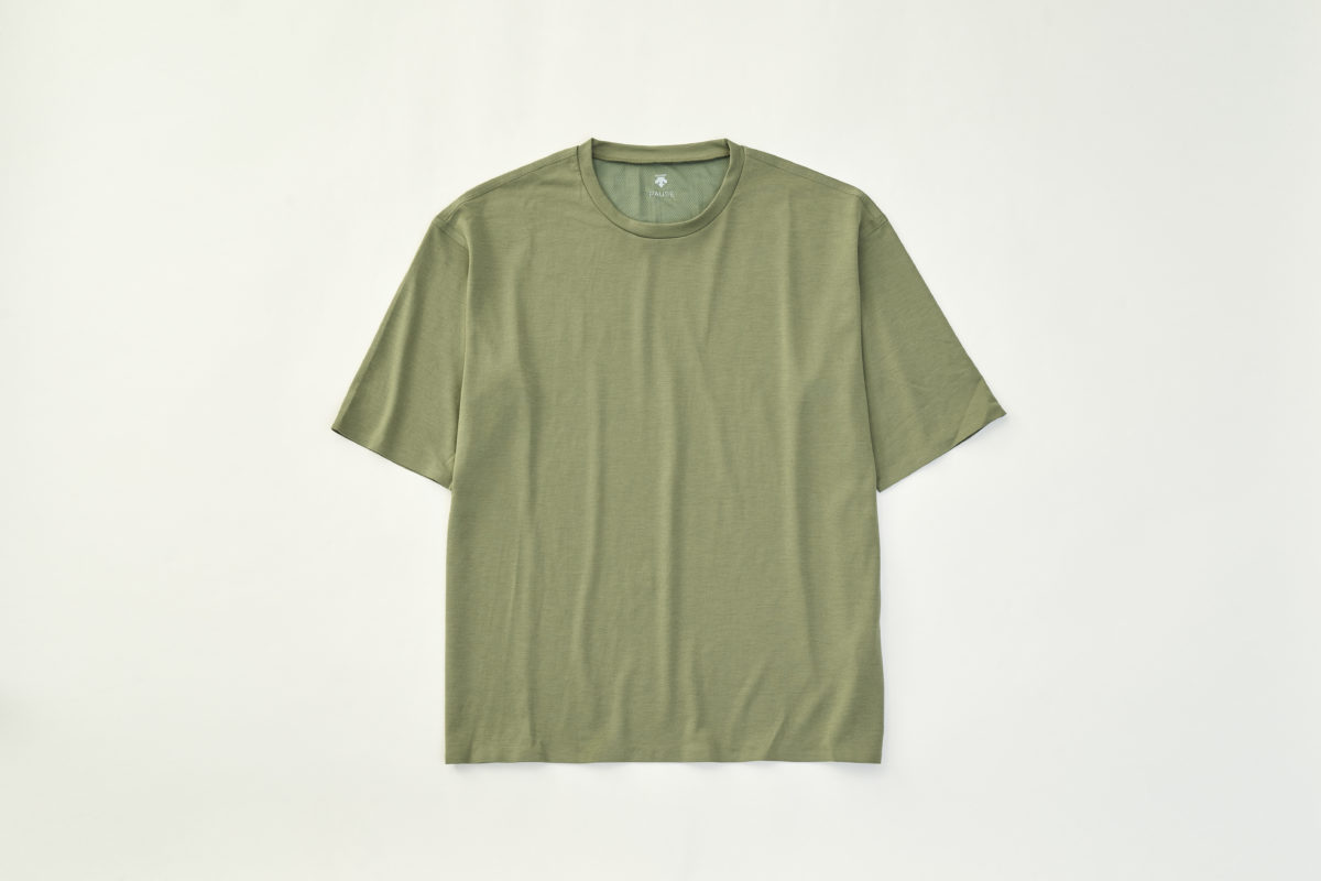 スポーツウェアブランド、デサントのユーティリティウェア「デサント ポーズ」。本Tシャツは衿ぐり以外の縫製をなくし、熱圧着の共生地テープにより、縫い目の肌あたりを軽減した快適な着心地となっています。表生地はポリエステルスパン糸を使い、綿のようなソフトなタッチ。肌側の生地は、ポリエステルのフィラメント糸を使ってハニカム構造に編むことにより、メッシュの空洞部分から汗を吸い上げる吸水速乾機能を備えています。