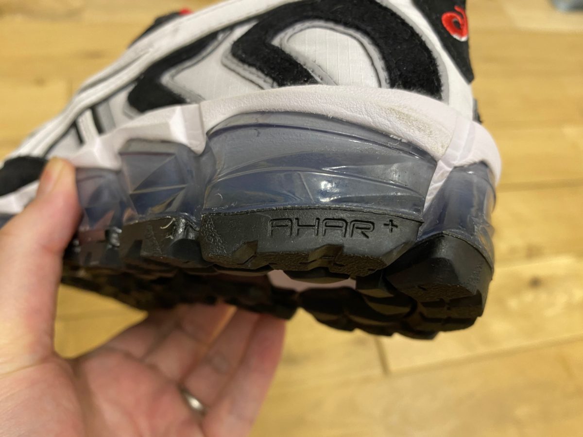 アウトソールには、自動車タイヤにも用いられているゴムを主材料に、補強材を配合することで耐摩耗性を向上させた「AHAR」素材を使用。オフロードでも高いグリップ力と耐久性を発揮します。