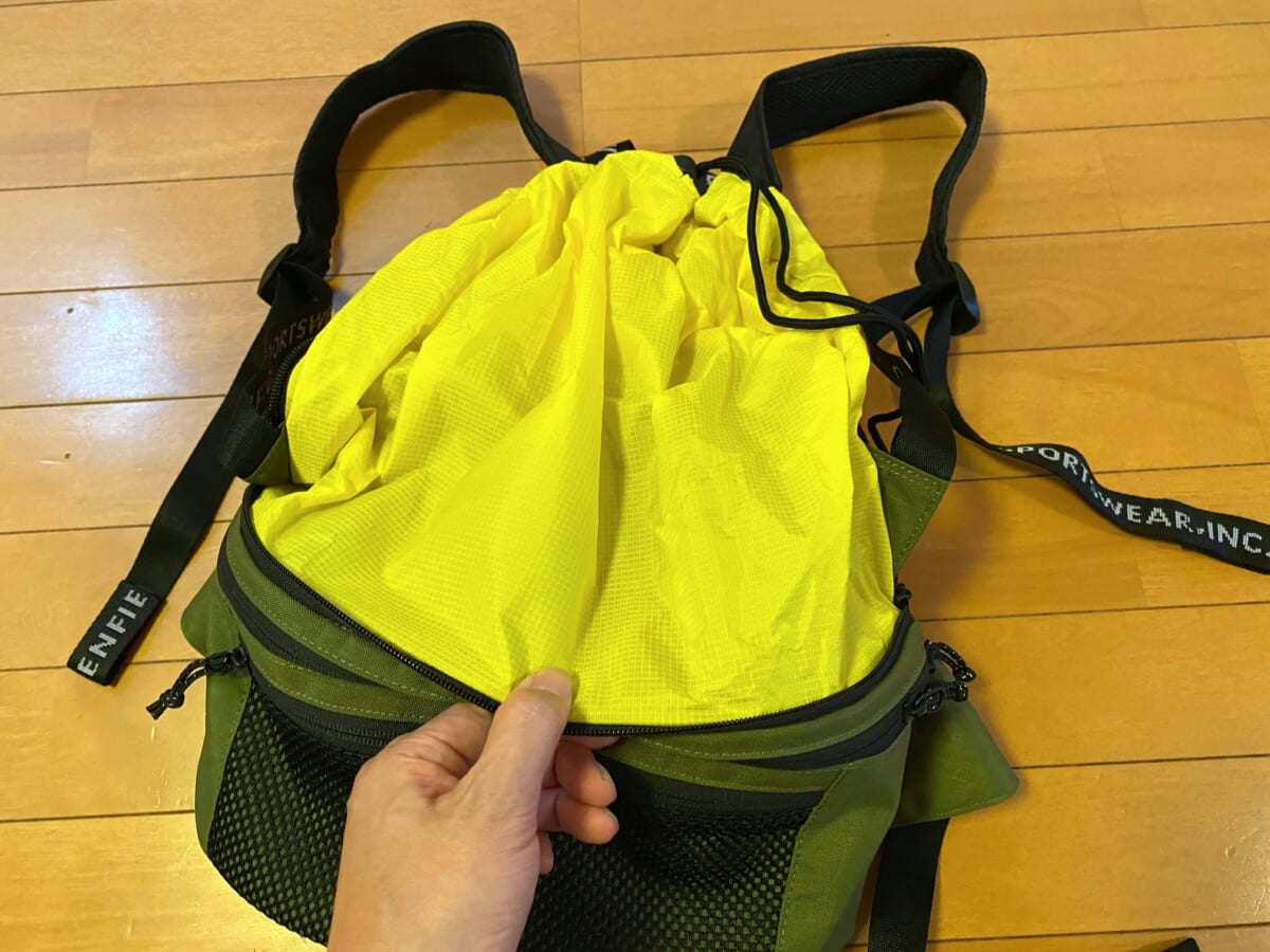 トップのポケット内にはナイロン生地が収納されていて、ストラップも付くので、広げればバックパックに早変わり!