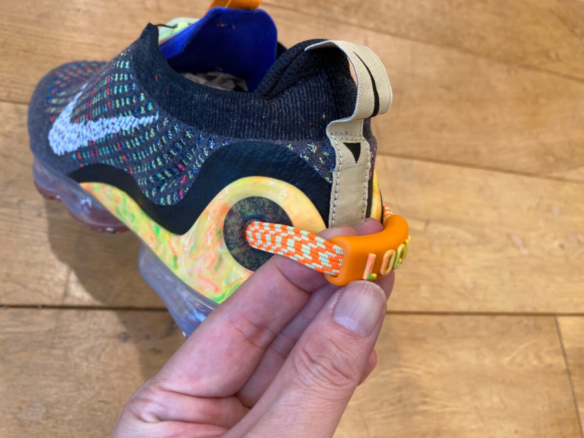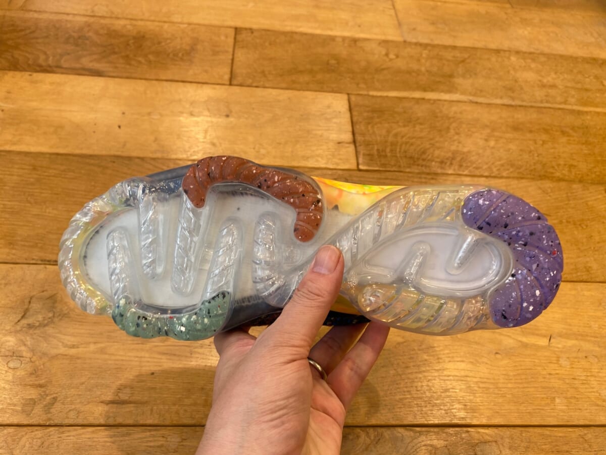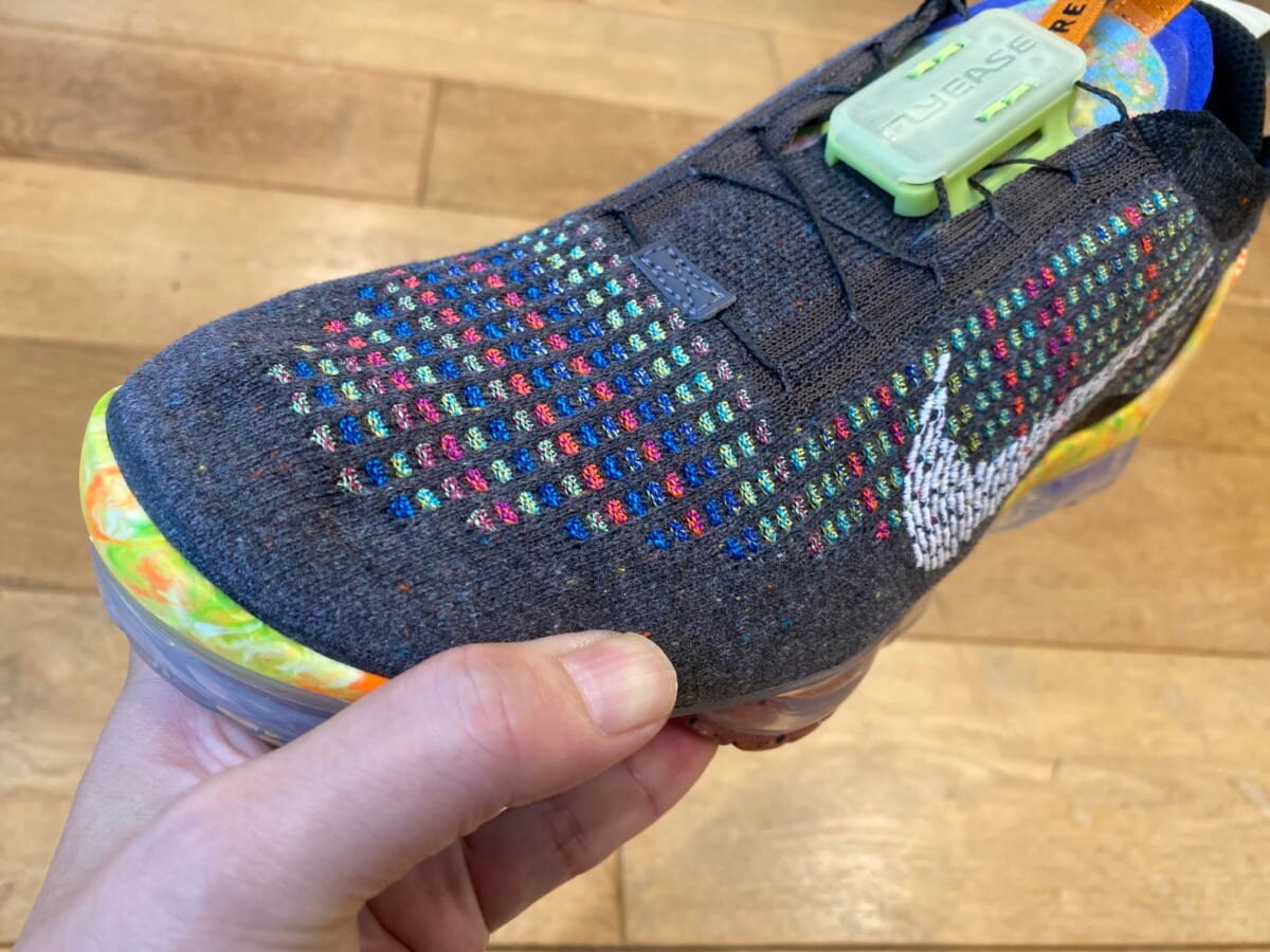 本作は重量の50%以上に、廃棄素材から紡いだリサイクル素材を使用。マルチカラーの色彩は、廃棄物の山の鳥瞰図からインスパイアされているんです。そしてシューレースには、障害の有無に関わらず、すべての人が着用しやすくすること目指した「FlyEase(フライイーズ)テクノロジー」を採用するなど、大幅にバージョンアップしています!