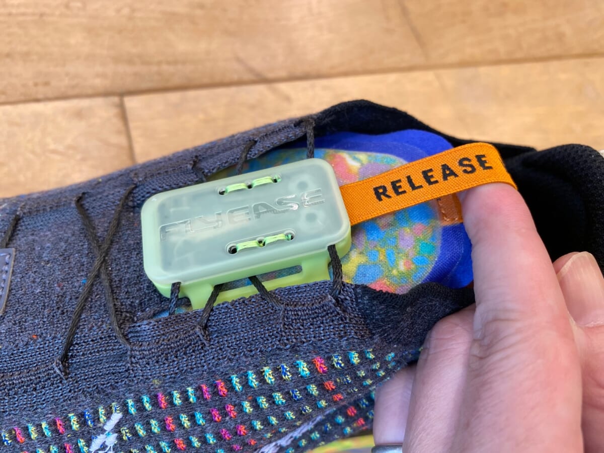 スニーカーを脱ぐ際には、甲上部分のFlyEaseテクノロジーのボックスに設けられたストラップを引くことで、レースが自動で緩んでくれます。
