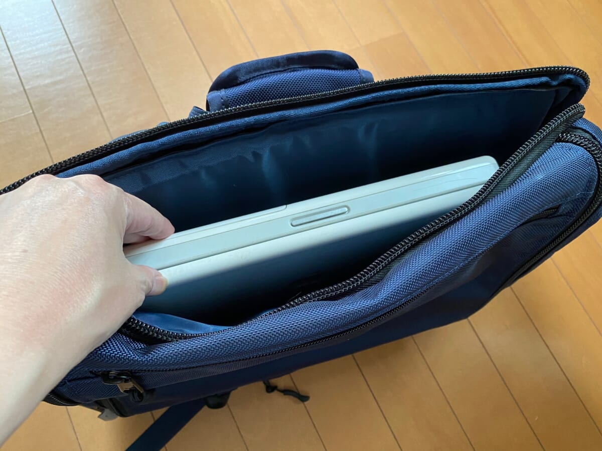 背中面のパッドに沿ってノートPCのスリーブが設けられていて、高いクッション性でPC機器を衝撃から守ってくれます。
