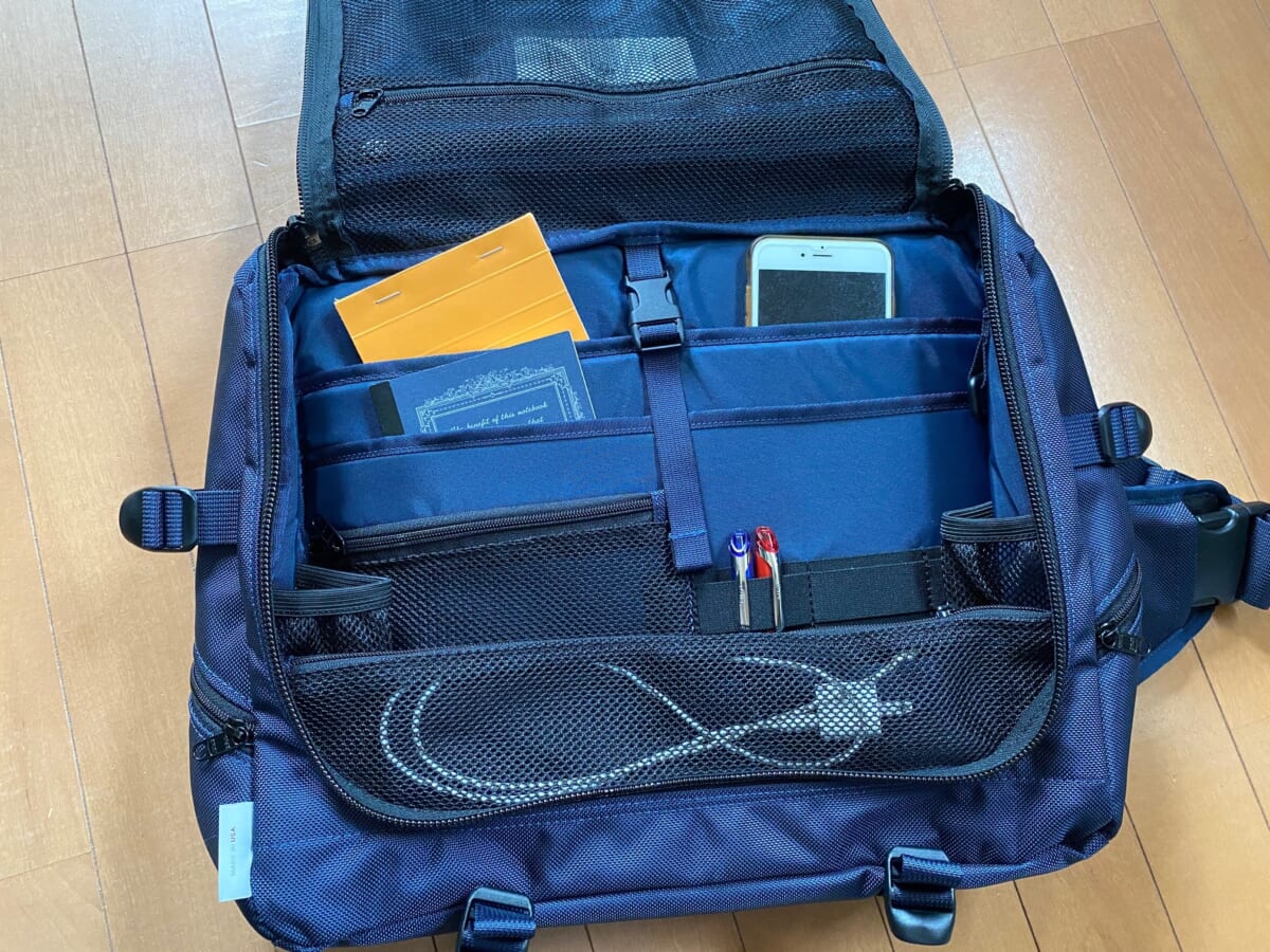 メインコンパートメントにはスマホや手帖、ペンなど様々なビジネス小物の収納に便利なオーガナイザーを完備。