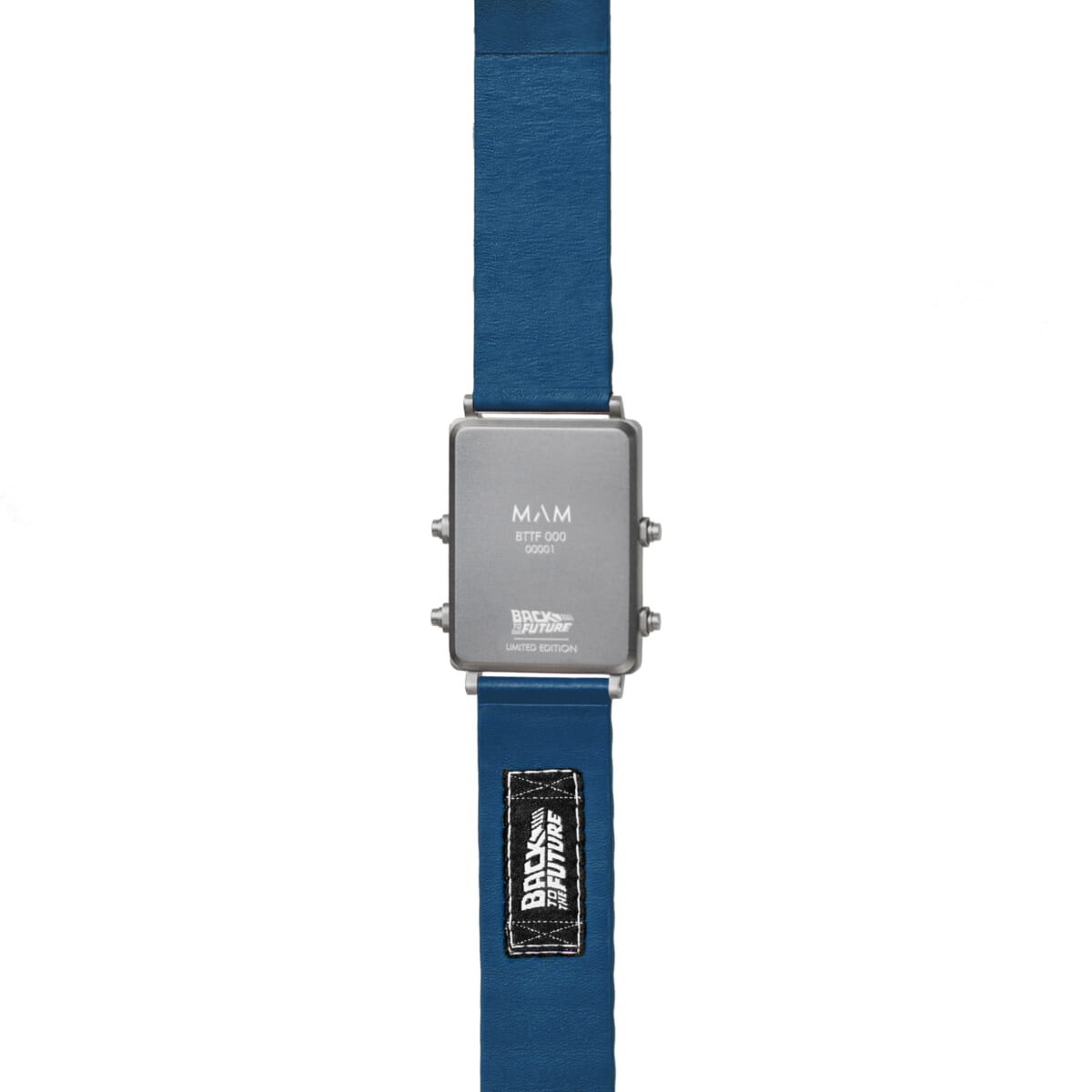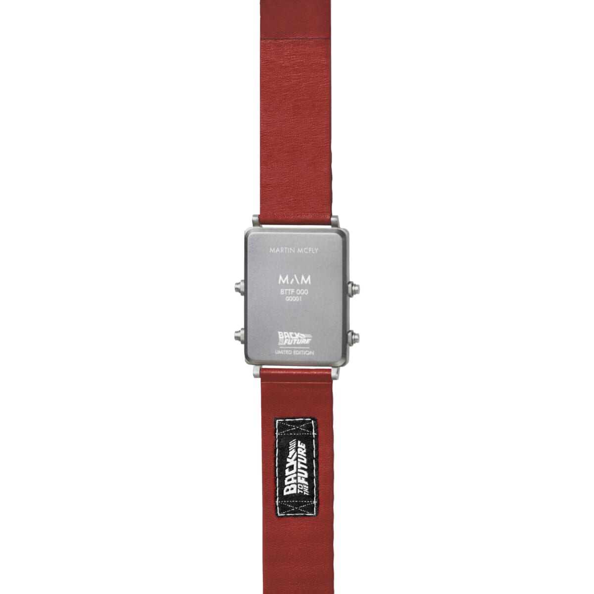 上部のLCD画面には時刻と日付。下部のLED画面には時刻、日付、曜日が表示され、傷のつきにくいサファイアガラスで覆われています。裏側には “バック ・トゥ・ザ・フューチャー”のロゴをステッチ。リサイクル素材で作られた高品質のベジタブルタンニンレザーを使用。 裏蓋にはシリアルアンバーが刻印されます。