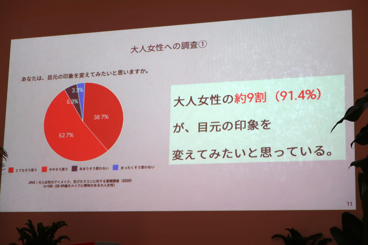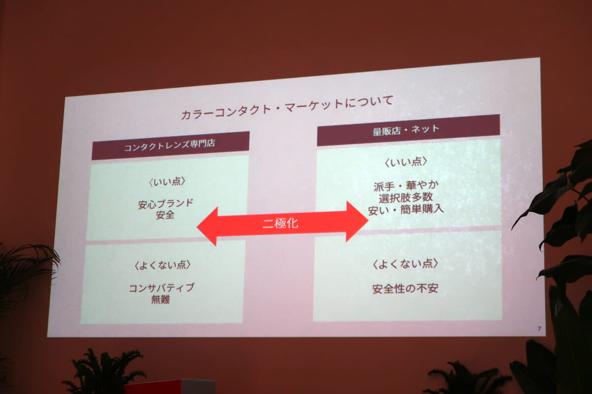 まず、ジンズホールディングスの池川さんが登壇し、ジンズがカラーコンタクトレンズ市場に参入する経緯と背景を語りました。ジンズは現在のカラコン市場が、「コンタクトレンズ専門店の安心・安全でコンサバティブなタイプ」と「ネットや量販店で買える手頃で派手にみえるタイプ」に二極化していることに着目。