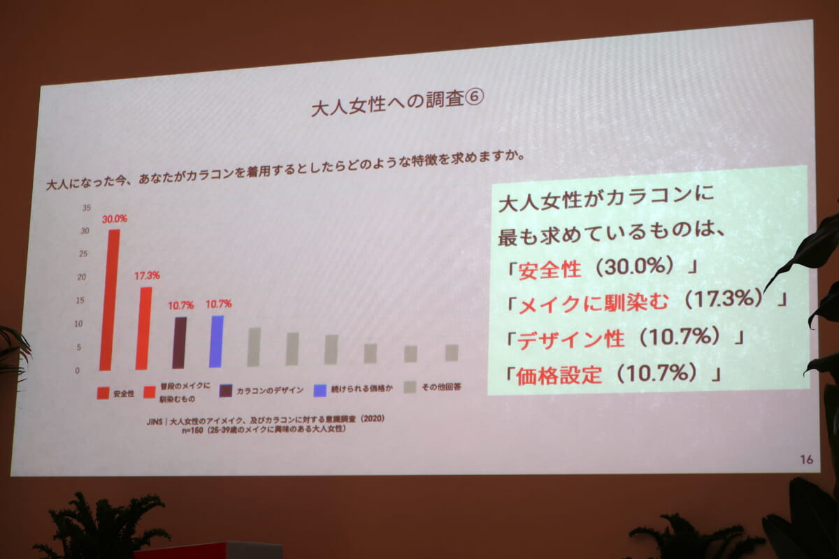 今、カラコンを着用するとしたらどのような特徴を求めるか聞いてみると、「安全性」が最も要望として多く、他にも普段のメイクに馴染むことや、デザイン面も求められていることが分かったとのこと。
