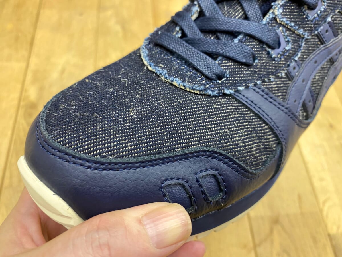 アシックスストライプはデニムと同色のレザーで、さり気なくも存在感をアピール。