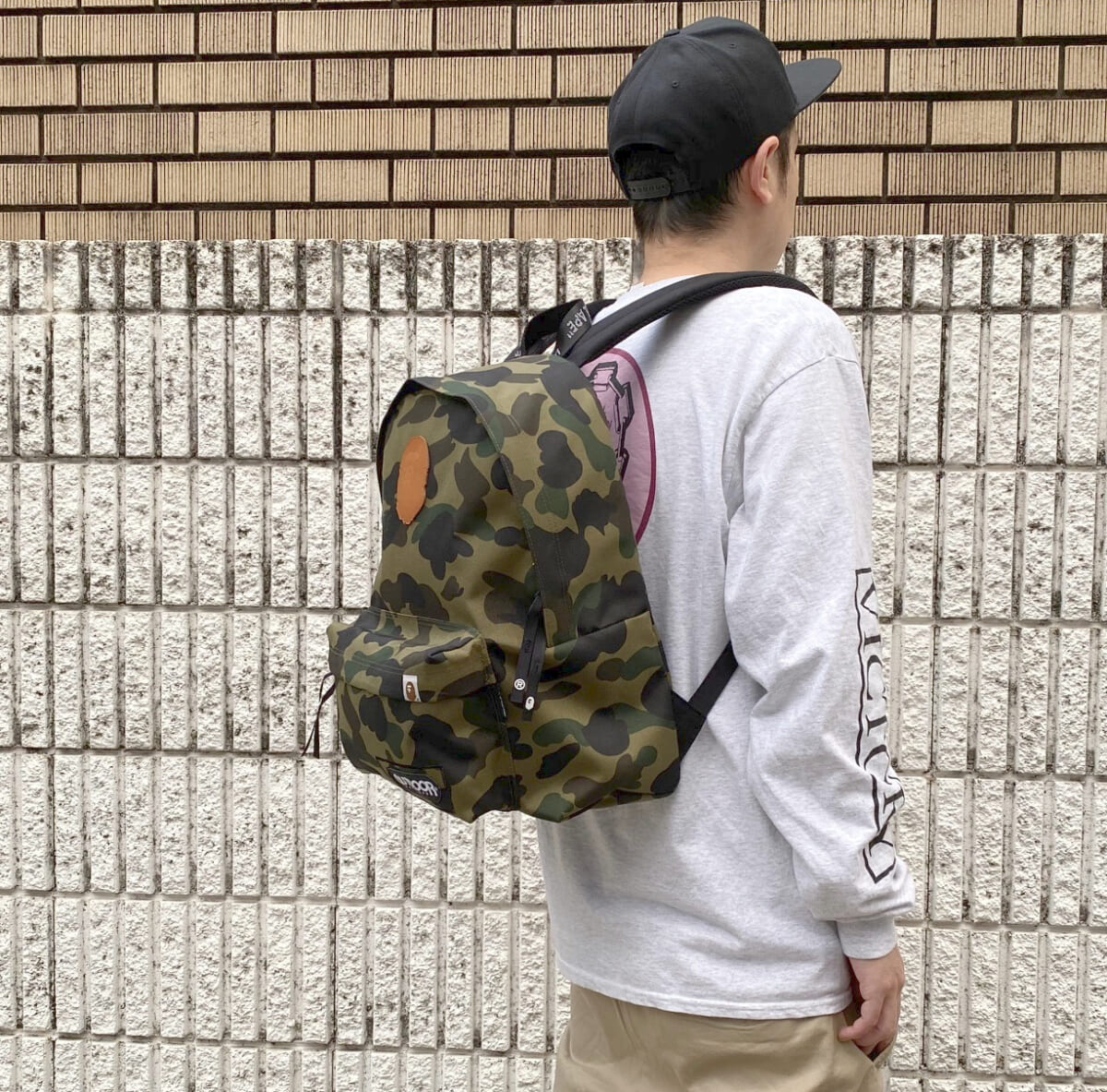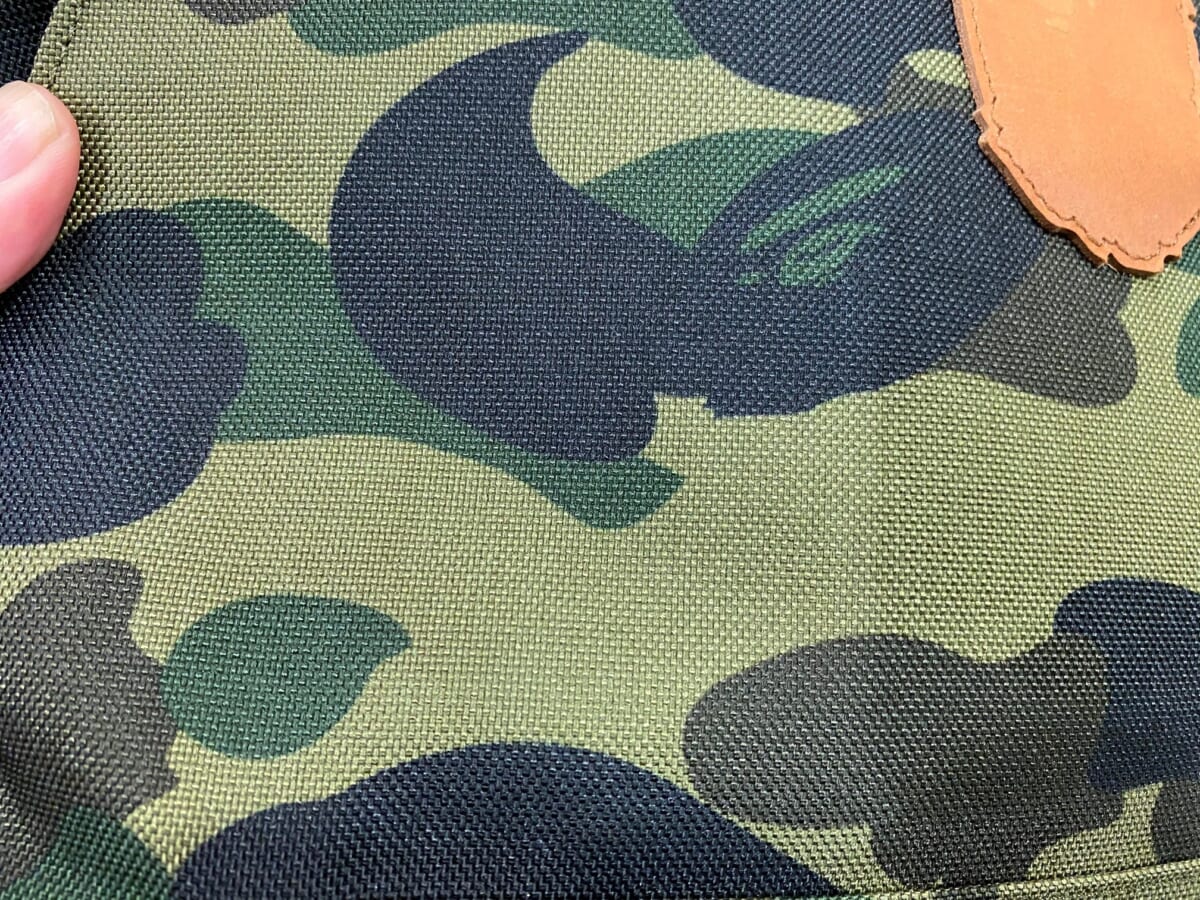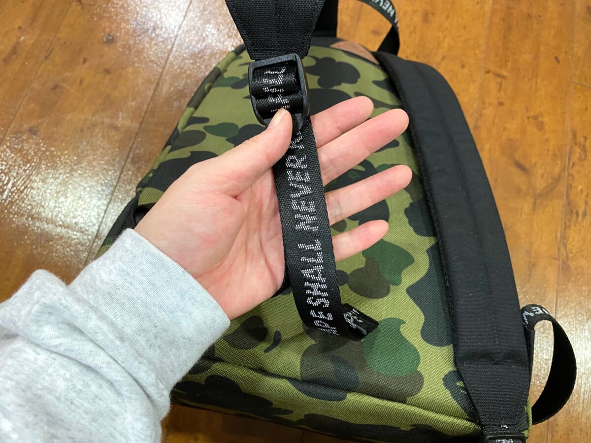 バッグのボディ全面に1ST CAMOパターンをあしらい、「A BATHING APE(R)」と「APE SHALL NEVER KILL APE」のロゴが入ったテープを使用したデザインがポイント。今コラボレーションでは気軽に使えるサコッシュと大容量のデイパックとドラムバックの3型がラインアップします。今回ワタクシはバックパックを実際にお試ししてみました!