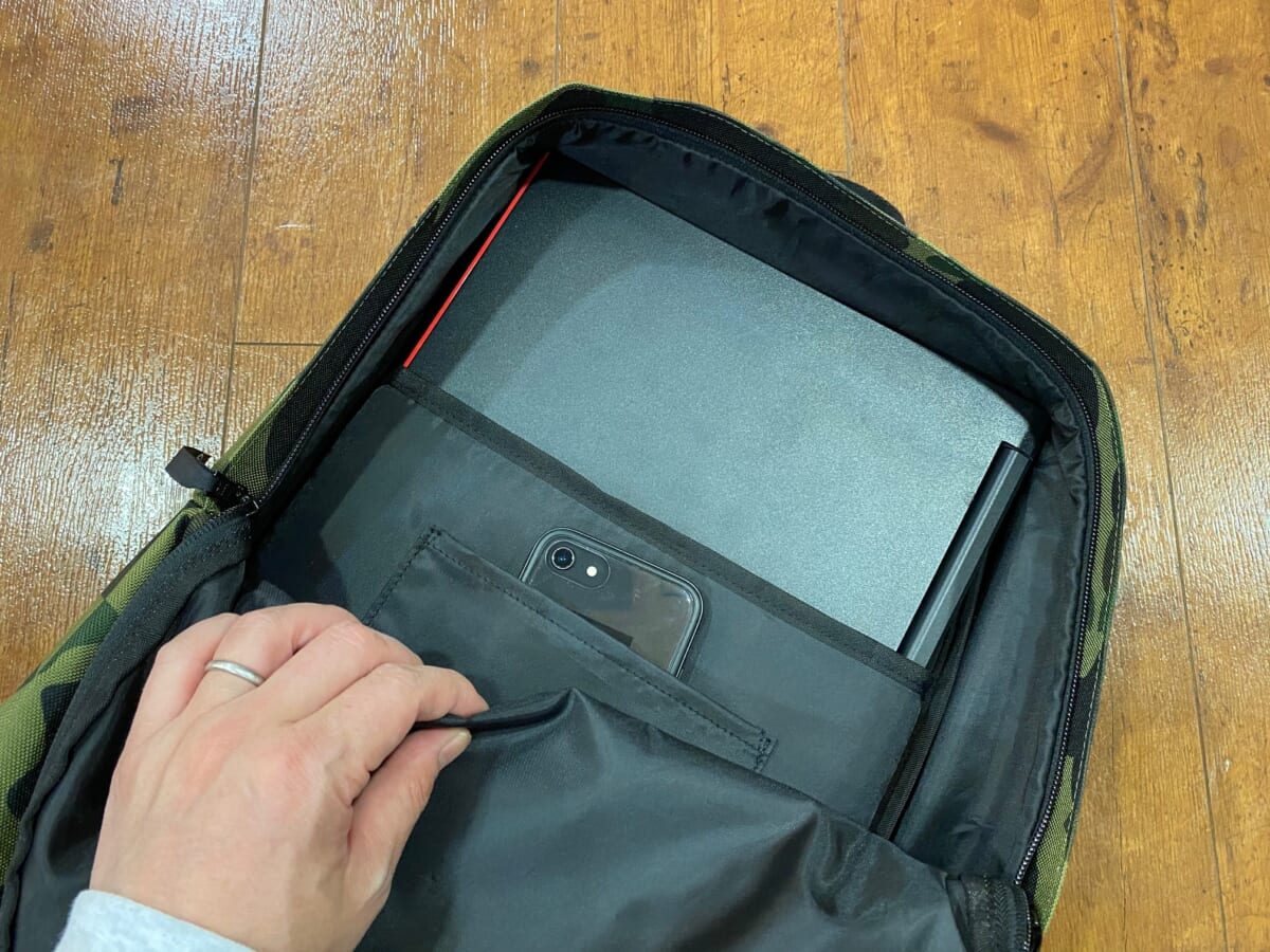 メインコンパートメントにはノートPCを収納できるスリーブやタブレット、スマホの収納に便利なポケットも付いて、収納力も申し分ありません。
