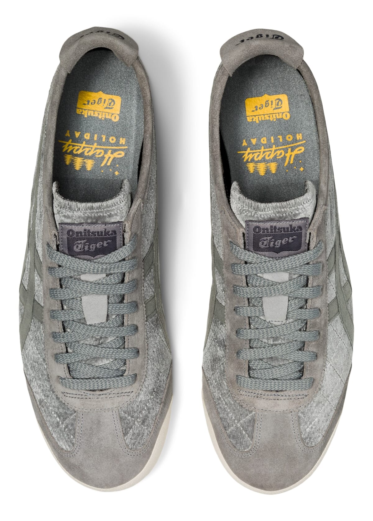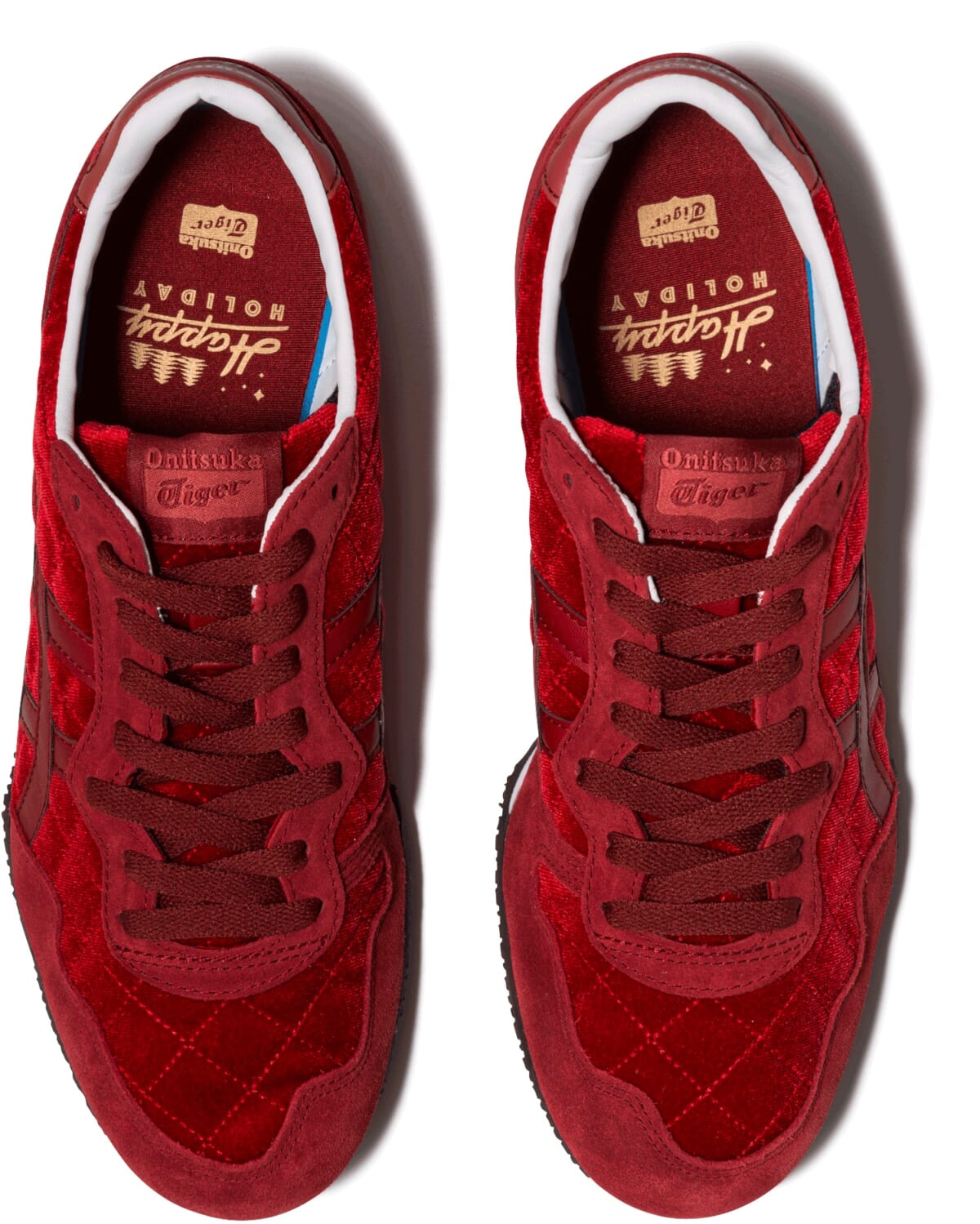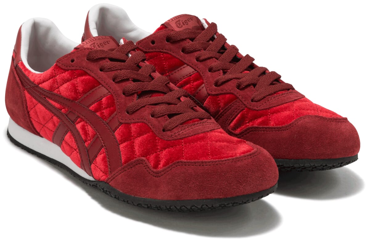 今回のホリデーキルティングシリーズは、オニツカタイガーの定番モデル「SERRANO」や「MEXICO 66」、「LAWNSHIP 3.0」に、艶感のあるベルベット素材をアッパー全体にあしらった素材アップデート版。キルティングステッチがアクセントとなり、上質でやわらかい雰囲気を表現。また、インナーソールには通常のオニツカタイガーロゴに加え、”Happy HOLIDAY”のプリントが施されています。