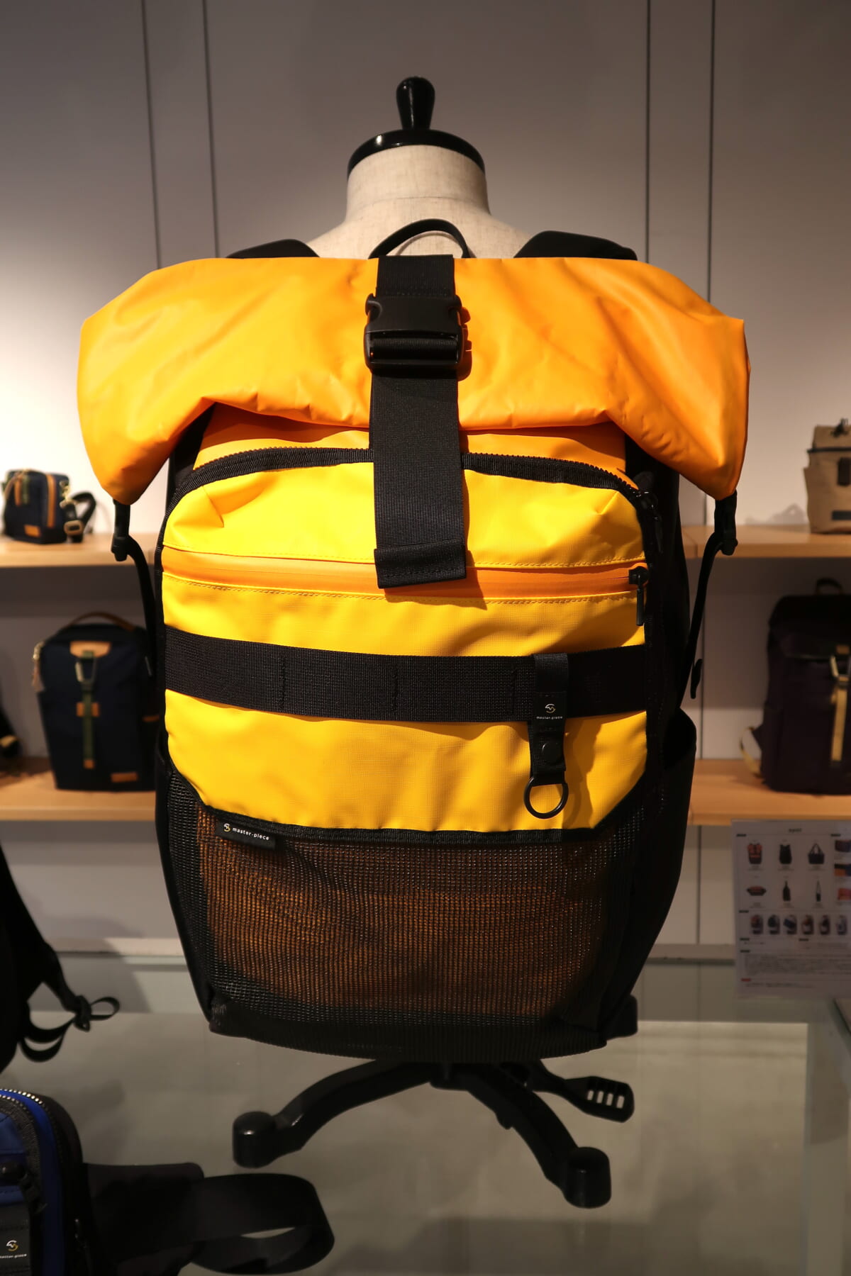 コロナ禍の影響もあり、趣味でアウトドアを楽しむ人が増えました。そんな外遊びに最適なシリーズが“spot”です。バックパックからフロントパックまで、全6タイプのバッグが大小揃っているので、遊び方に応じて選ぶことができます。最大の特徴は、透湿防水フィルムをラミネート加工したターポリン素材の採用で、高い防水性を実現していること。同系色を2種類使っているので、シンプルなデザインですが奥行きが生まれています。さらに、摩擦や擦り切れなどにも強い耐久性を備えているので、タフに扱うことができます。