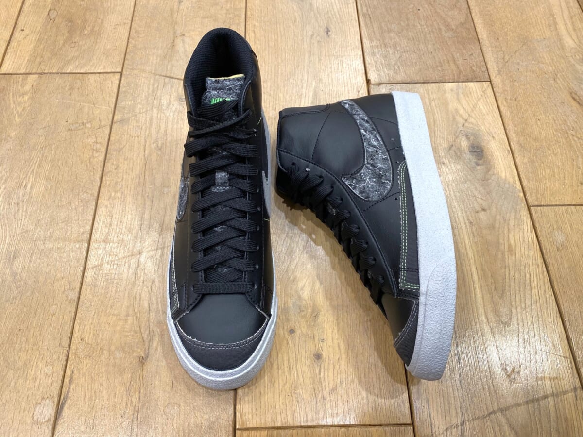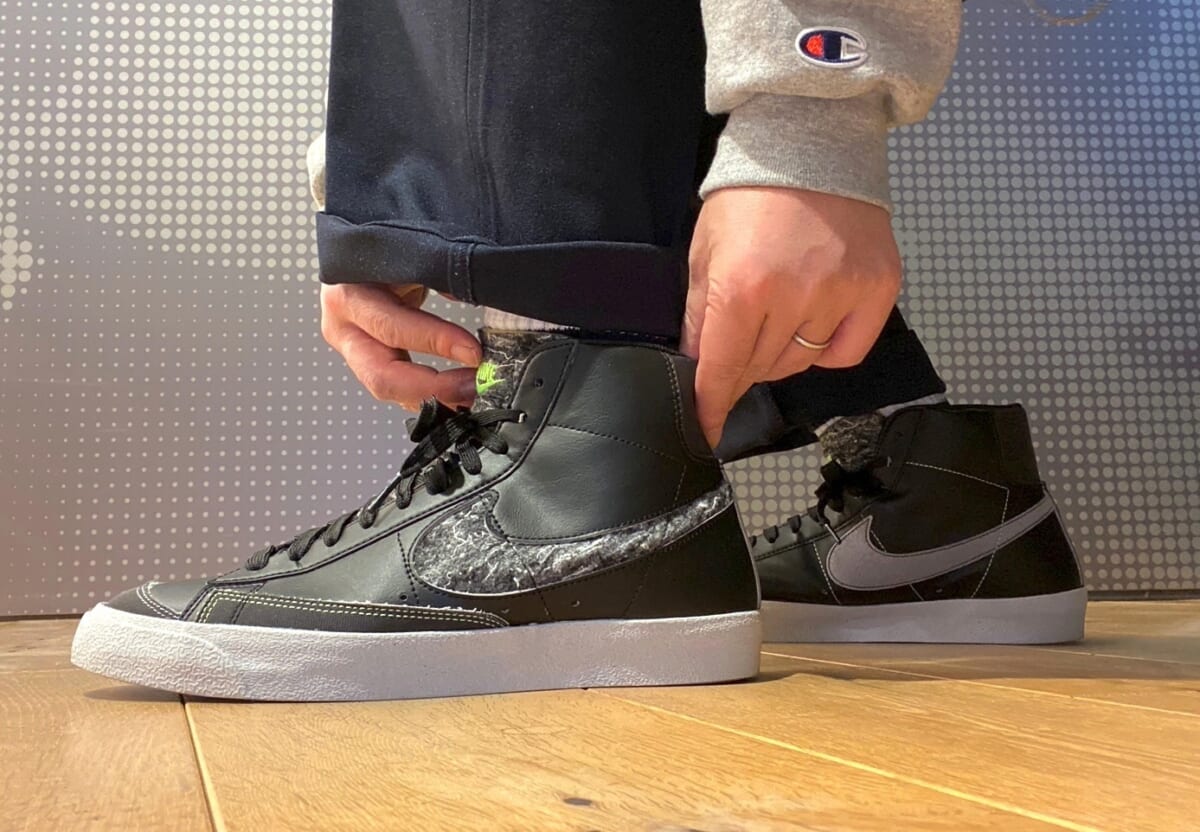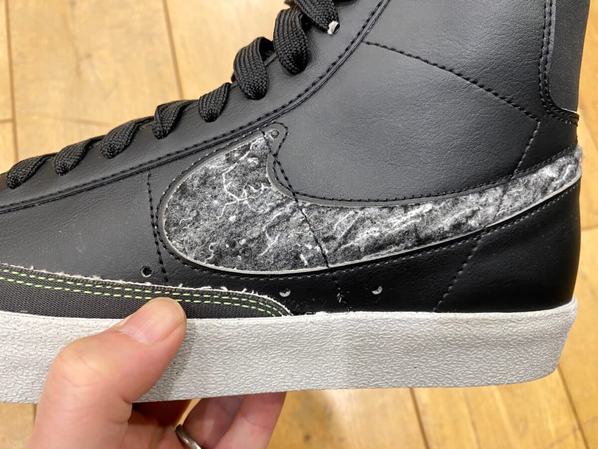 アッパーにはリサイクル合成皮革を採用し、スウッシュロゴにはリサイクルフェルトを使用したりと、クラシックなデザインとリサイクル素材を組み合わせることで、新鮮なスタイルへと仕上げられました。ブレーザーならではのシンプルフォルムやディテールはそのままに、総重量の20%以上にリサイクル素材を使用しているのです!