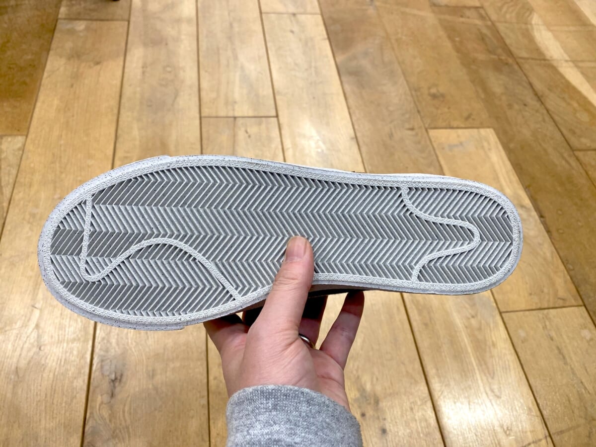 アウトソールは、回収されたシューズのリサイクル素材で形成された「Nike Grindラバー」を採用。斑点模様のようにツブツブが混じり合ったようなルックスが特徴的です。