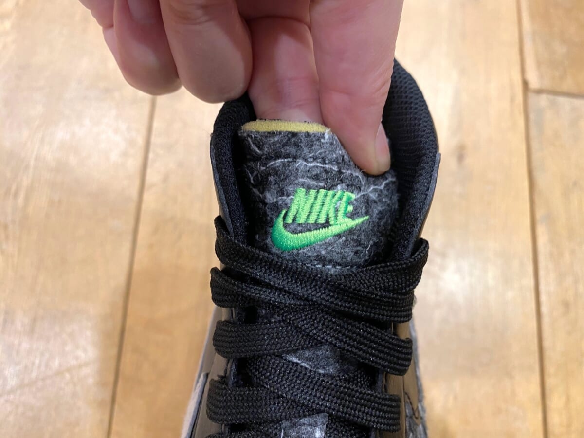 シュータンも100%リサイクルフェルトを採用。ナイキのロゴ刺しゅうはあえて艶やかなパステルグリーンであしらわれていて、ビビッドなアクセントに機能しています。