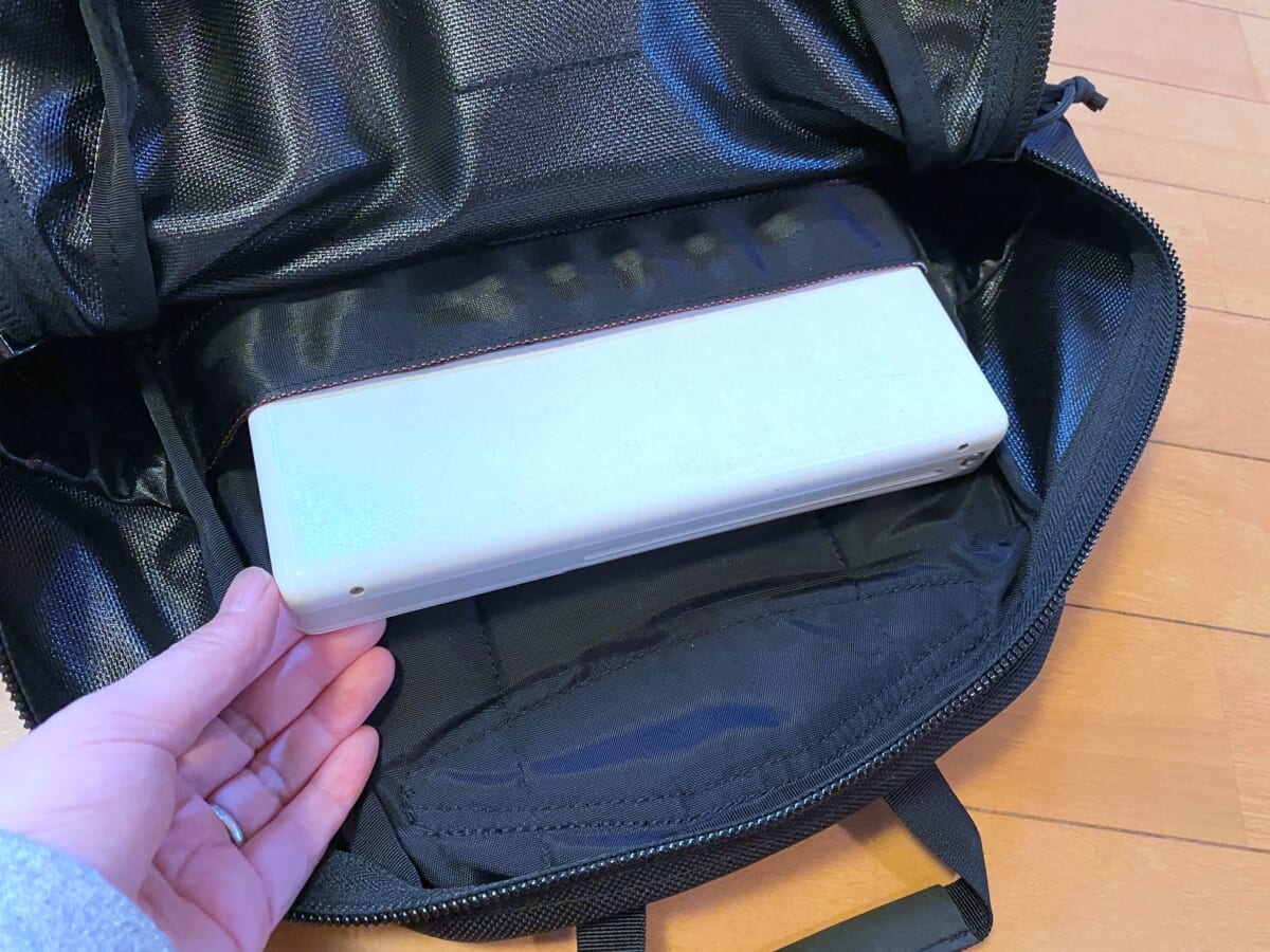15インチ程度までのPCが収納可能なPCスリーブを搭載しています。ワタクシのブ厚いクラシックiBookもラクラク収納できます。