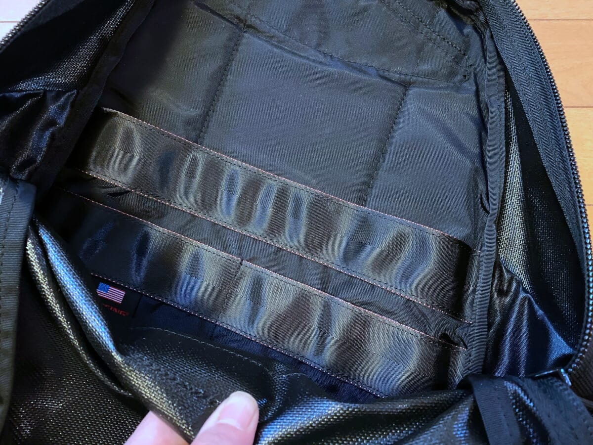 メインコンパートメント内に設けられたウェビングテープには従来通りのレッドラインが入り、開閉時のチラ見せ効果あり!