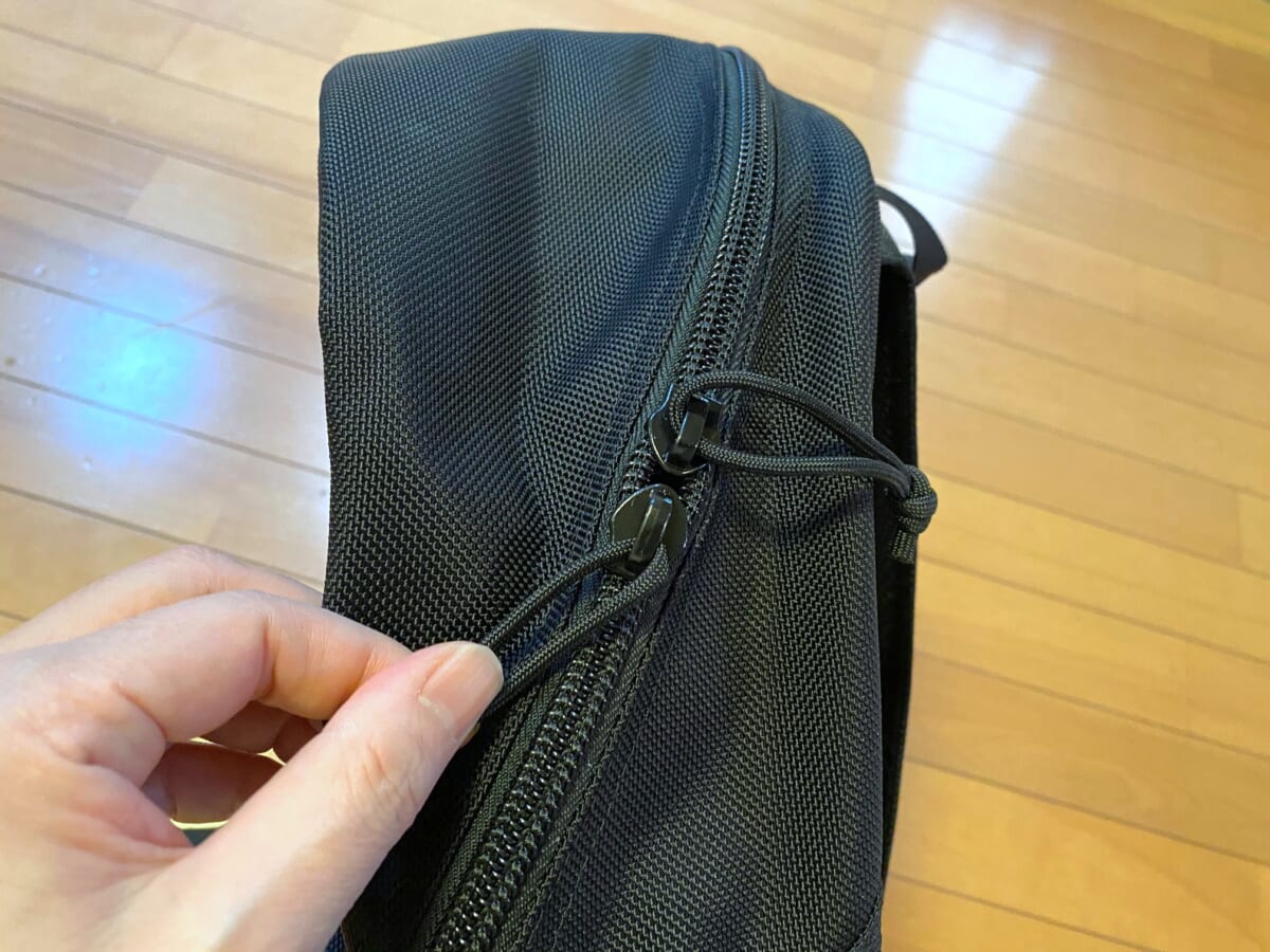 メインコンパートメントとサイドポケットともにファスナーを斜めに配置し、荷物の出し入れがスムーズな設計に。