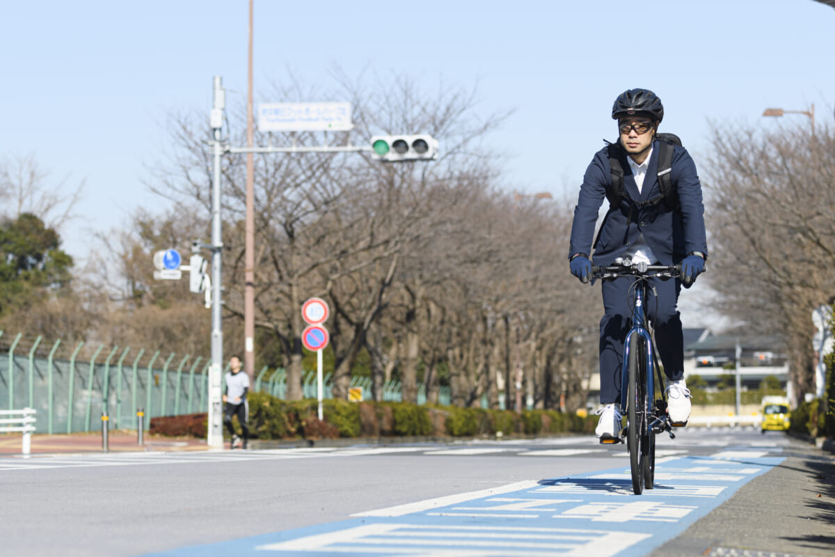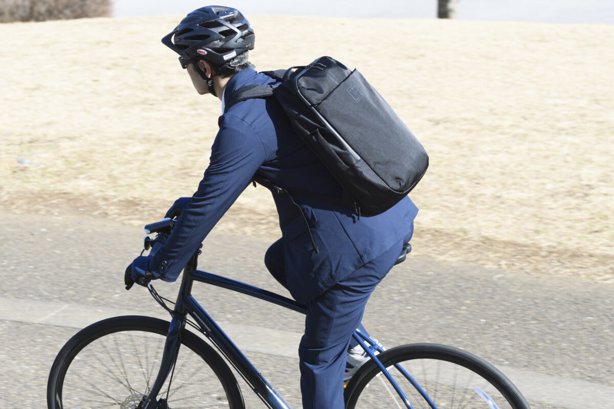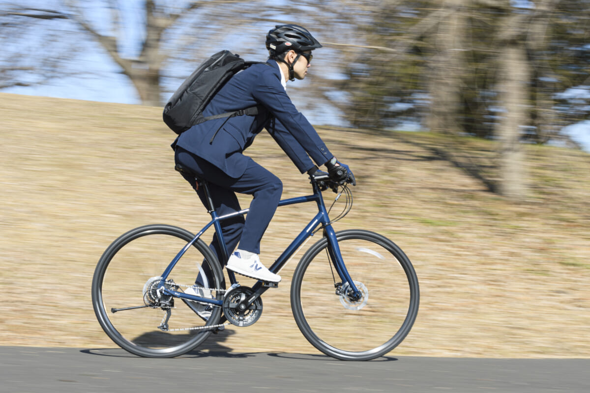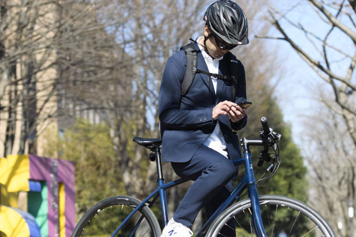 スポーツタイプの自転車は、ハンドルの押し引きなど上半身も積極的に使うのが、スピードを維持するコツですが、ジャケットも抜群の動きやすさでストレスがありません。乗っている本人は上下サイクルジャージを着ているような気分なのですが、写真で見るとスーツを着ているビジネスマンのように見えるのが不思議な感覚です。