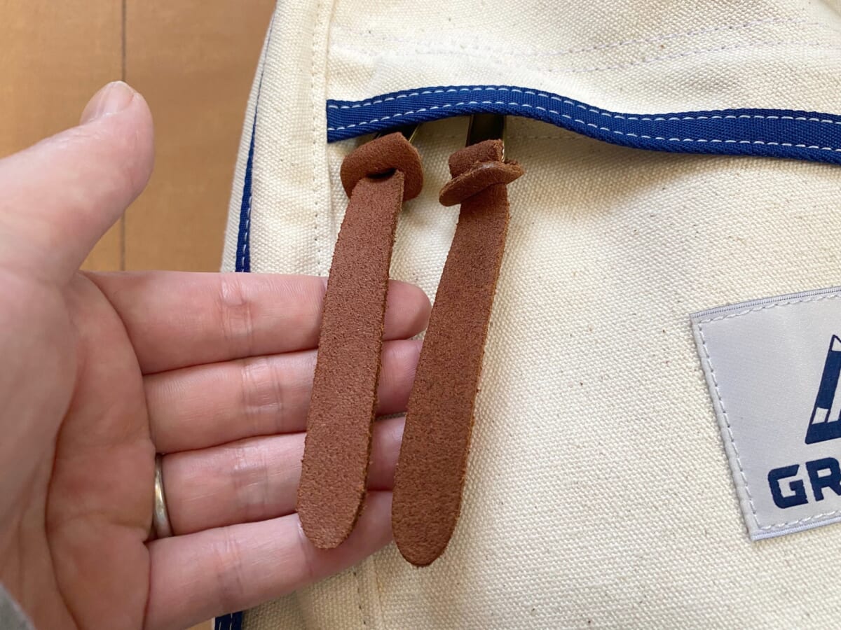 ファスナーの引き手に付くストラップは通常モデルと同様のレザーを踏襲。生成りのヘビーコットンと相性バッチリです。