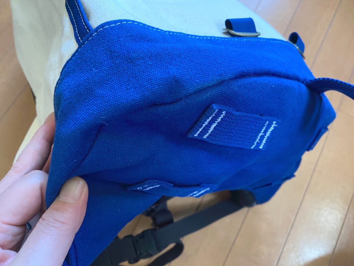 トップやフロントに設けられているウェイビングテープや、それに付けられているストラップもコットンキャンバスを採用。