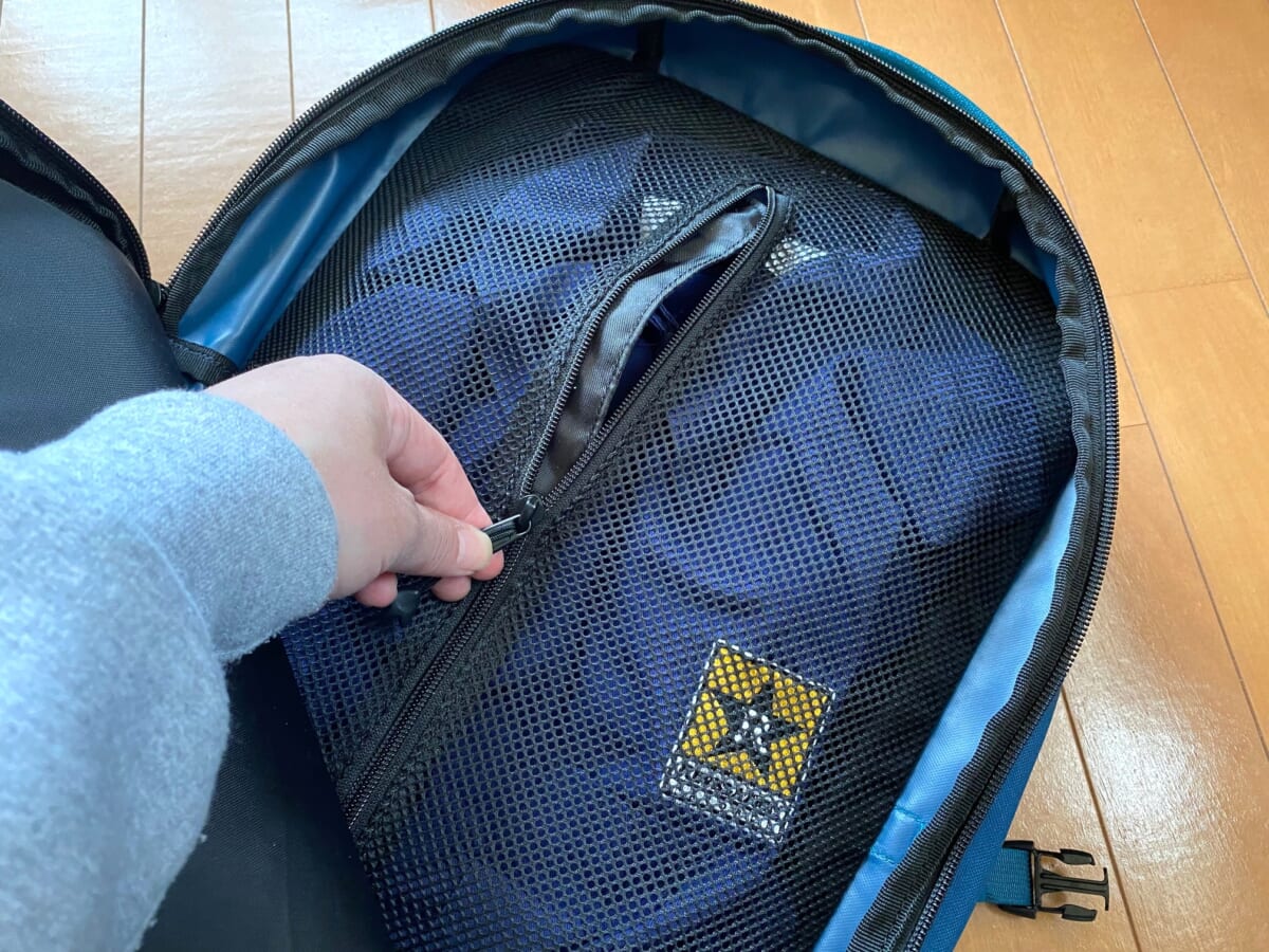 メインコンパートメントには大きめなメッシュポケットが付くので、例えば、着替え用のシャツなどを収納することも可能。
