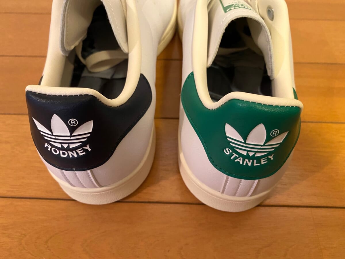 一見するといつものスタンスミスですが、よく見ると右足がスタン・スミス仕様、そして左足がロッド・レーバー仕様と、2人のキャラクターをしっかりと使い分けています。まさに2人の偉人への敬意を表した一足といえます。「実はこのスニーカーってさ……」という感じで、さり気なくウンチクを披露するのもありかと思いますよ!
